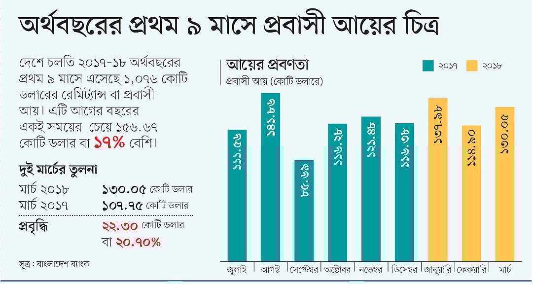 বাংলাদেশ ব্যাংকের প্রতিবেদন অনুযায়ী, চলতি ২০১৭-১৮ অর্থবছরের প্রথম নয় মাসে (জুলাই-মার্চ) ব্যাংকিং চ্যানেলে প্রবাসীরা ১ হাজার ৭৬ কোটি ১২ লাখ ডলার পাঠিয়েছেন। গত অর্থবছরের একই সময়ে যার পরিমাণ ছিল ৯১৯ কোটি ৪৫ লাখ ডলার। সেই হিসাবে আগের বছরের একই সময়ের চেয়ে চলতি অর্থবছরের নয় মাসে প্রবাসী আয় ১৭ শতাংশ বেড়েছে।