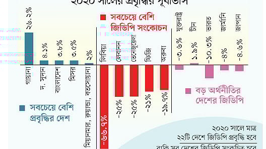 মাত্র ২২টি দেশ ছাড়া বাকি সব দেশেই জিডিপি প্রবৃদ্ধি নেতিবাচক হবে বলে মনে করছে আইএমএফ। সবচেয়ে বেশি জিডিপি সংকোচন হবে লিবিয়ায়, প্রায় ৬৭ শতাংশ। এ ছাড়া ভেনেজুয়েলা, লেবানন, ফিজিতে ২০ শতাংশের বেশি জিডিপি সংকুচিত হতে পারে।