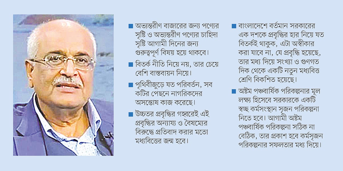 দেবপ্রিয় ভট্টাচার্য: এসব কিছুর পরেও যে জিনিসটি সবচেয়ে বড় হয়ে থাকবে সেটি হলো কর্মসংস্থান। অষ্টম পঞ্চবার্ষিক পরিকল্পনার মূল লক্ষ্য হিসেবে সরকারকে অবশ্যই একটি স্বচ্ছ কর্মসংস্থান সৃজন পরিকল্পনা নিতে হবে। আগামী অষ্টম পঞ্চবার্ষিক পরিকল্পনা সঠিক না বেঠিক, তার প্রকাশ হবে তার কর্মসৃজন পরিকল্পনার সফলতার মধ্য দিয়ে। এর সঙ্গে গুরুত্বপূর্ণ হচ্ছে ব্যক্তি খাতের বিনিয়োগ, কয়েক বছর ধরে যা স্থবির হয়ে আছে। সরকার যদি ব্যক্তি খাতের বিনিয়োগের বাধাগুলো দূর করতে না পারে, তাহলে কাজ হবে না। আর এত দিন আমরা বৈদেশিক বাজারকে লক্ষ্য করে অনেক পরিকল্পনা করেছি। করোনা আমাদের দেখিয়েছে, অভ্যন্তরীণ বাজারই অনেক গুরুত্বপূর্ণ। অভ্যন্তরীণ বাজারের জন্য পণ্যের সৃষ্টি ও অভ্যন্তরীণ পণ্যের চাহিদা সৃষ্টি আগামী দিনের জন্য গুরুত্বপূর্ণ বিষয় হয়ে থাকবে। এই সামষ্টিক চাহিদা বৃদ্ধির মূল চালিকা শক্তি যদি আমরা দেশের ভেতরের মানুষের ক্রয়ক্ষমতা থেকে করতে পারি, তাহলে অন্য বিষয়গুলোর সমাধান অনেকটাই হয়ে যাবে। এ ক্ষেত্রে আলোচনায় চলে আসবে বিকাশমান মধ্যবিত্ত।