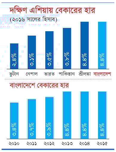 প্রতিবেদনে বলা হয়েছে, ২০১৩ সাল থেকে গত বছর পর্যন্ত বাংলাদেশের বেকারত্বের হার ছিল ৪ দশমিক ৪ শতাংশ। চলতি কিংবা আগামী বছরেও হারটি কমবে না। দক্ষিণ এশিয়ার আটটি দেশের মধ্যে বেকারের সর্বোচ্চ হারের দিক থেকে বাংলাদেশ তৃতীয় অবস্থানে। তবে বাংলাদেশের চেয়ে যুদ্ধবিধ্বস্ত দেশ আফগানিস্তান ও দ্বীপদেশ মালদ্বীপে বেকার মানুষের হার বেশি।