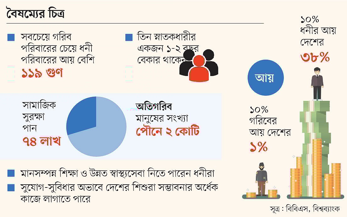 বাংলাদেশ এখন উচ্চ বৈষম্যের দিকে যাচ্ছে। বাংলাদেশ পরিসংখ্যান ব্যুরোর (বিবিএস) সর্বশেষ খানা আয় ও ব্যয় জরিপ অনুযায়ী, দেশের সবচেয়ে গরিব ২০ লাখ পরিবারের প্রতি মাসে গড় আয় মাত্র ৭৪৬ টাকা। আর সবচেয়ে ধনী ২০ লাখ পরিবারের গড় আয় ৮৯ হাজার টাকা। এই ধনী পরিবারগুলো সবচেয়ে গরিব পরিবারগুলোর চেয়ে ১১৯ গুণ বেশি আয় করে। আয়বৈষম্যের কারণে মানসম্পন্ন শিক্ষা, স্বাস্থ্যসেবাসহ জীবনমান উন্নত করার সুযোগ থেকে পিছিয়ে থাকছে গরিব পরিবারগুলো। বিবিএস বলছে, দেশের মানুষের যত আয়, তার ৩৮ শতাংশই হলো সবচেয়ে ধনী ১০ শতাংশ মানুষের। আর সবচেয়ে গরিব ১০ শতাংশের হাতে মাত্র ১ শতাংশের মতো আয়।