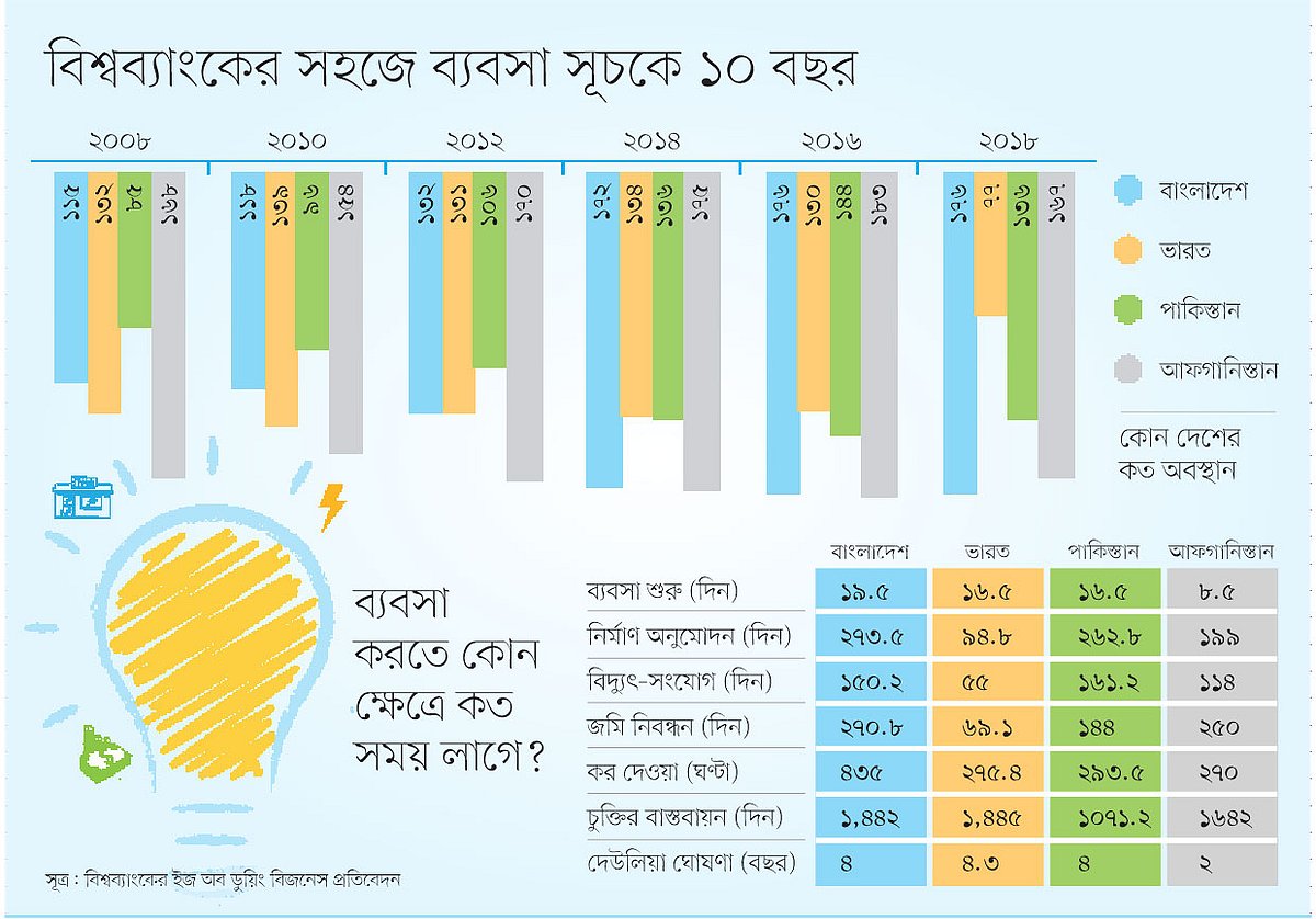 বিশ্বব্যাংকের ইজ অব ডুয়িং বিজনেস বা সহজে ব্যবসা সূচকে ১০ বছর আগে বাংলাদেশের বেশ পেছনে ছিল ভারত। এরপর বাংলাদেশ শুধু পিছিয়েছে। আর ভারত মাত্র তিন বছরে ৫৩ ধাপ এগিয়ে ৭৭তম অবস্থানে উঠে এসেছে। তলানিতে থাকা আফগানিস্তান পাঁচটি কাজ করে ১৬ ধাপ লাফ দিয়েছে।