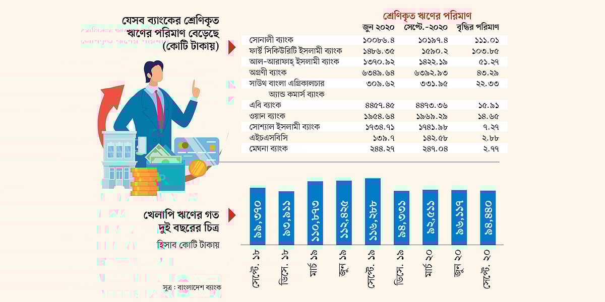 এদিকে চলতি বছরের তৃতীয় প্রান্তিকে কিছু ব্যাংকের খেলাপি ঋণ বেড়েছে। খেলাপি ঋণ বৃদ্ধিতে শীর্ষ ১০ ব্যাংক হলো সোনালী, ফার্স্ট সিকিউরিটি, আল-আরাফাহ্, অগ্রণী, সাউথ বাংলা অ্যাগ্রিকালচার অ্যান্ড কমার্স, এবি, ওয়ান, সোশ্যাল ইসলামী, এইচএসবিসি ও মেঘনা ব্যাংক।