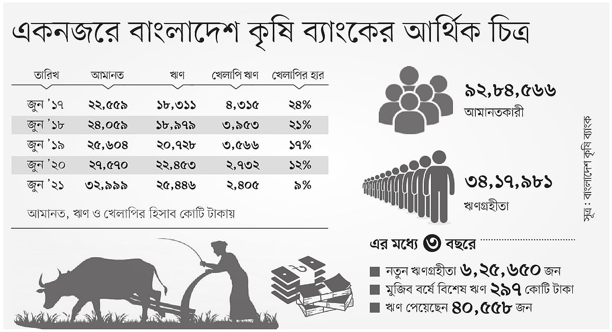 বড় শিল্পে ঋণ দিয়ে খেলাপির জালে আটকা পড়েছিল রাষ্ট্রমালিকানাধীন বাংলাদেশ কৃষি ব্যাংক (বিকেবি)। তবে এখন কৃষকদের ঋণ দিয়ে আবার মূল লক্ষ্যে ফিরে আসছে ব্যাংকটি। আগে নেননি এমন কৃষক খুঁজে ঋণ দিচ্ছে। নতুন আমানত ও প্রবাসী আয় সংগ্রহে জোর দিয়েছে।