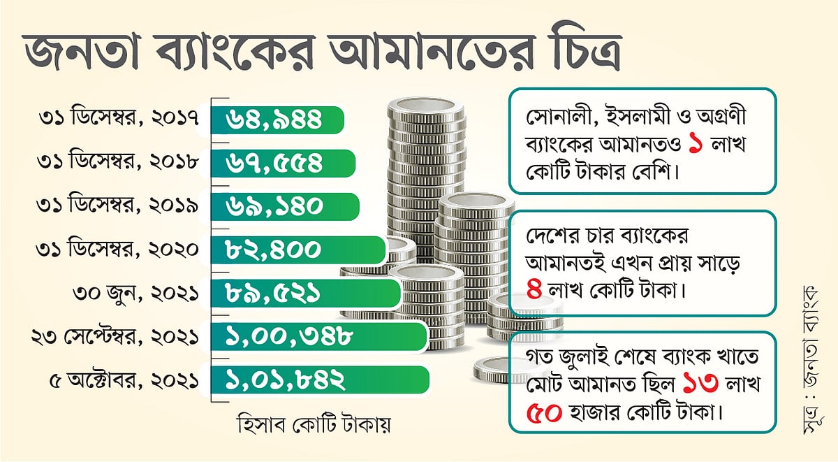 রাষ্ট্রমালিকানাধীন সোনালী ব্যাংকের আমানত ২০১৬ সালেই এক ট্রিলিয়ন বা এক লাখ কোটি টাকা ছাড়িয়ে যায়। এরপর ২০২০ সালের জুনে এক লাখ কোটি টাকার আমানতের ক্লাবে প্রবেশ করে বেসরকারি খাতের ইসলামী ব্যাংক। চলতি বছরের জুনে এই ক্লাবে ঢুকে রাষ্ট্র খাতের অগ্রণী ব্যাংক। আর গত ২৩ সেপ্টেম্বর জনতা ব্যাংকের আমানত বেড়ে ১ লাখ ৩৪৮ কোটি টাকায় ওঠে। তা গত মঙ্গলবার বেড়ে হয় ১ লাখ ১ হাজার ৮৪২ কোটি টাকা। এর ৩০ শতাংশই সরকারি খাতের আমানত। বর্তমানে এই ব্যাংকের বিতরণ করা ঋণের পরিমাণ বেড়ে ৬৮ হাজার ৩২৮ কোটি টাকায় উঠেছে।