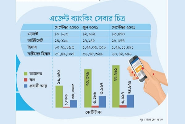 সর্বস্তরের মানুষকে ব্যাংকিং সেবার আওতায় আনতে ২০১৪ সালের ১৭ জানুয়ারি দেশে এজেন্ট ব্যাংকিং নামে নতুন ধাঁচের এ সেবা চালু হয়েছিল। গত ২০২০ সালের সেপ্টেম্বর পর্যন্ত নতুন এ ব্যাংকিং কার্যক্রমের আওতায় হিসাব খুলেছেন মোট ৮২ লাখ গ্রাহক। আর সদ্য বিদায়ী ২০২১ সালের একই মাসে (সেপ্টেম্বর) গ্রাহকসংখ্যা বেড়ে দাঁড়িয়েছে ১ কোটি ৩০ লাখ। অর্থাৎ মাত্র এক বছরে যুক্ত হয়েছে প্রায় ৫০ লাখ নতুন গ্রাহক। যাত্রা শুরুর পর থেকে এখন পর্যন্ত আট বছরে দেশব্যাপী পাড়া-মহল্লা ও হাটবাজারে সাড়ে ১৩ হাজার এজেন্ট ও ১৮ হাজার আউটলেট এ সেবা দিচ্ছে।