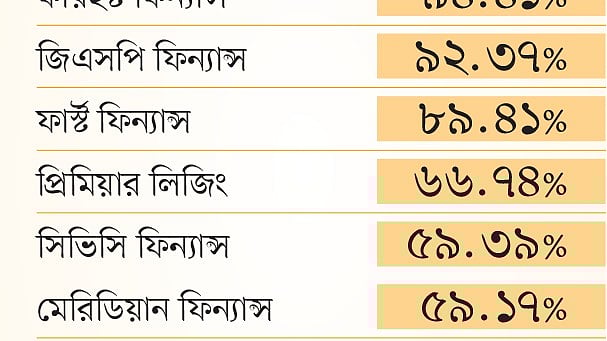 এর বাইরে ফারইস্ট ফিন্যান্সের খেলাপি ঋণ ৯৪ দশমিক ৪১ শতাংশ, যা জিএসপি ফিন্যান্সের ৯২ দশমিক ৩৭ শতাংশ, ফার্স্ট ফিন্যান্সের ৮৯ দশমিক ৪১ শতাংশ, প্রিমিয়ার লিজিংয়ের ৬৬ দশমিক ৭৪ শতাংশ, সিভিসি ফিন্যান্সের ৫৯ দশমিক ৩৯ শতাংশ, মেরিডিয়ান ফিন্যান্সের ৫৯ দশমিক ১৭ শতাংশ, আইআইডিএফসির ৫৮ দশমিক ৬৪ শতাংশ, হজ ফিন্যান্সের ৫৭ দশমিক ৭৯ শতাংশ, ফিনিক্স ফিন্যান্সের ৫৭ দশমিক ৭৯ শতাংশ, ন্যাশনাল ফিন্যান্সের ৫৬ দশমিক ৮৬ শতাংশ, বে লিজিংয়ের ৫২ দশমিক ৮২ শতাংশ ও উত্তরা ফিন্যান্সের ৫০ দশমিক ৪৮ শতাংশ।