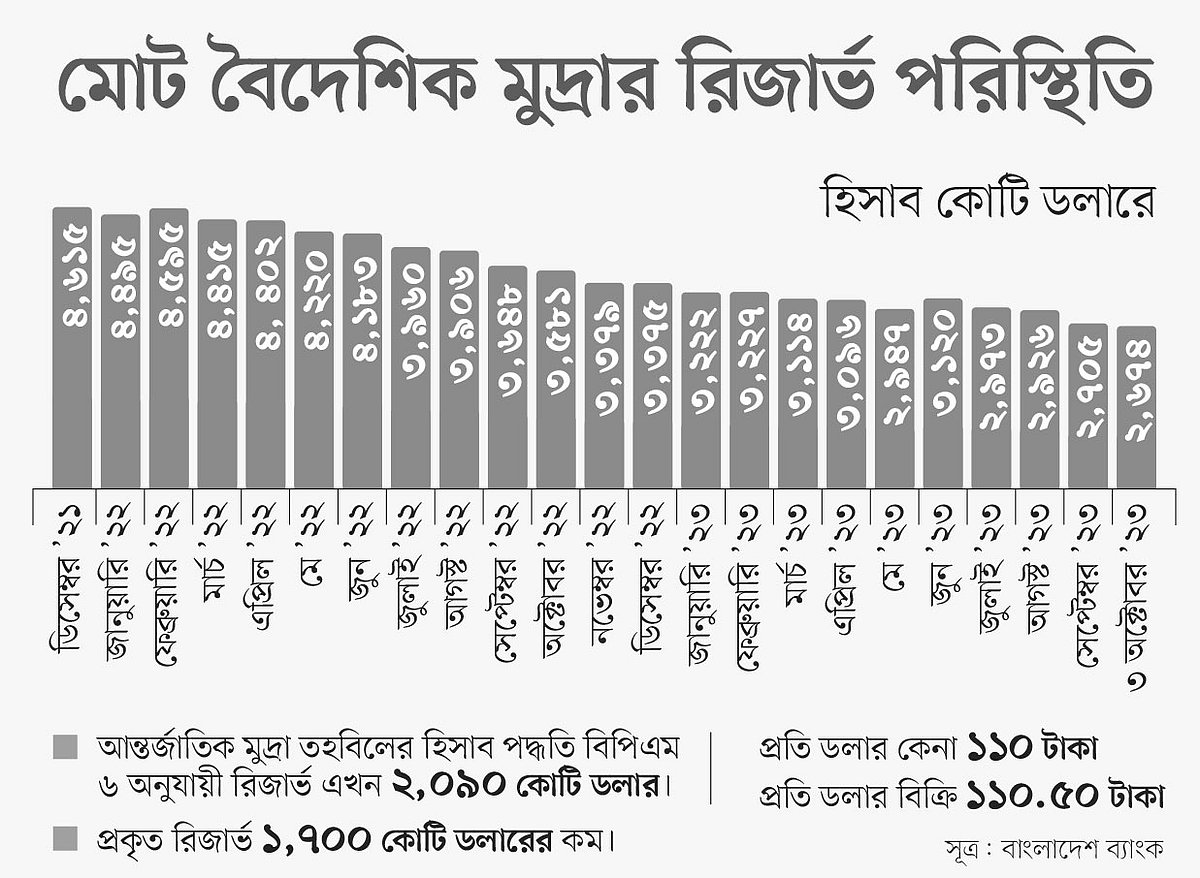 ২০২১ সালের আগস্টে বাংলাদেশ ব্যাংকের কাছে বৈদেশিক মুদ্রার মজুত বা রিজার্ভ ছিল ৪ হাজার ৮০০ কোটি বা ৪৮ বিলিয়ন ডলারের বেশি। সেই রিজার্ভ এখন কমে হয়েছে ২ হাজার ৬৭৪ কোটি (২৬ দশমিক ৭৪ বিলিয়ন) ডলার। আন্তর্জাতিক মুদ্রা তহবিলের (আইএমএফ) হিসাবপদ্ধতি বিপিএম ৬ অনুযায়ী, রিজার্ভ বর্তমানে ২ হাজার ৯০ কোটি (২০ দশমিক ৯০ বিলিয়ন) ডলার।