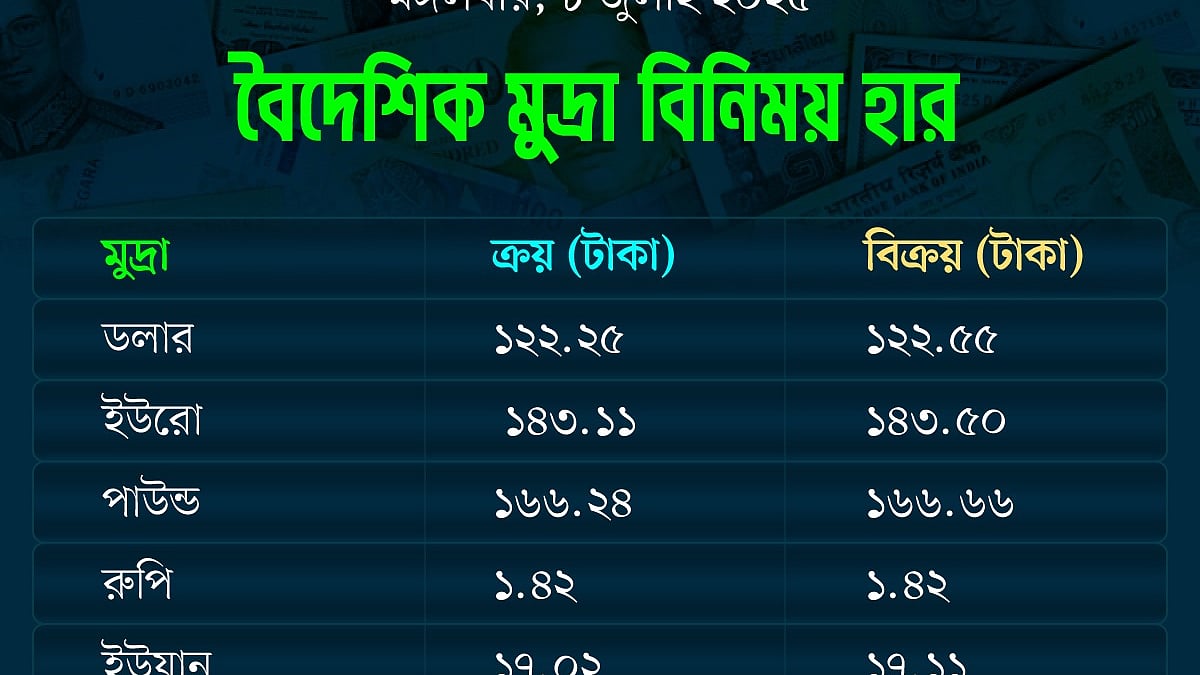 বাংলাদেশ ব্যাংকের তথ্যানুসারে, দেশের মুদ্রাবাজারে আজ ডলারের সর্বোচ্চ দাম ১২২ দশমিক ৫৫ টাকা ও সর্বনিম্ন দর ১২২ দশমিক ২৫ টাকা। আজ ডলারের গড় দাম ১২২ দশমিক ৪০ টাকা।