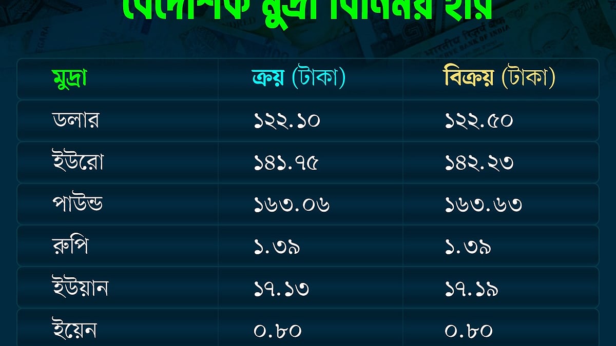 আজ দেশের মুদ্রাবাজারে প্রধান মুদ্রাগুলোর মধ্যে দাম বেড়েছে ইউরো, পাউন্ড, ভারতীয় রুপি, ইউয়ান, অস্ট্রেলীয় ডলার, সিঙ্গাপুরি ডলার। অপরিবর্তিত আছে জাপানের ইয়েনের দাম।