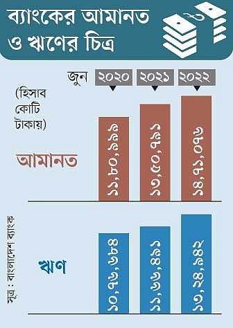 ২০২১ সালের জুলাই থেকে গত জুন পর্যন্ত ব্যাংক খাতে আমানত বেড়েছে ১ লাখ ২০ হাজার ২৮৫ কোটি টাকা। এই এক বছরে ঋণ বাড়ে ১ লাখ ৫৮ হাজার ৪৫১ কোটি টাকা।