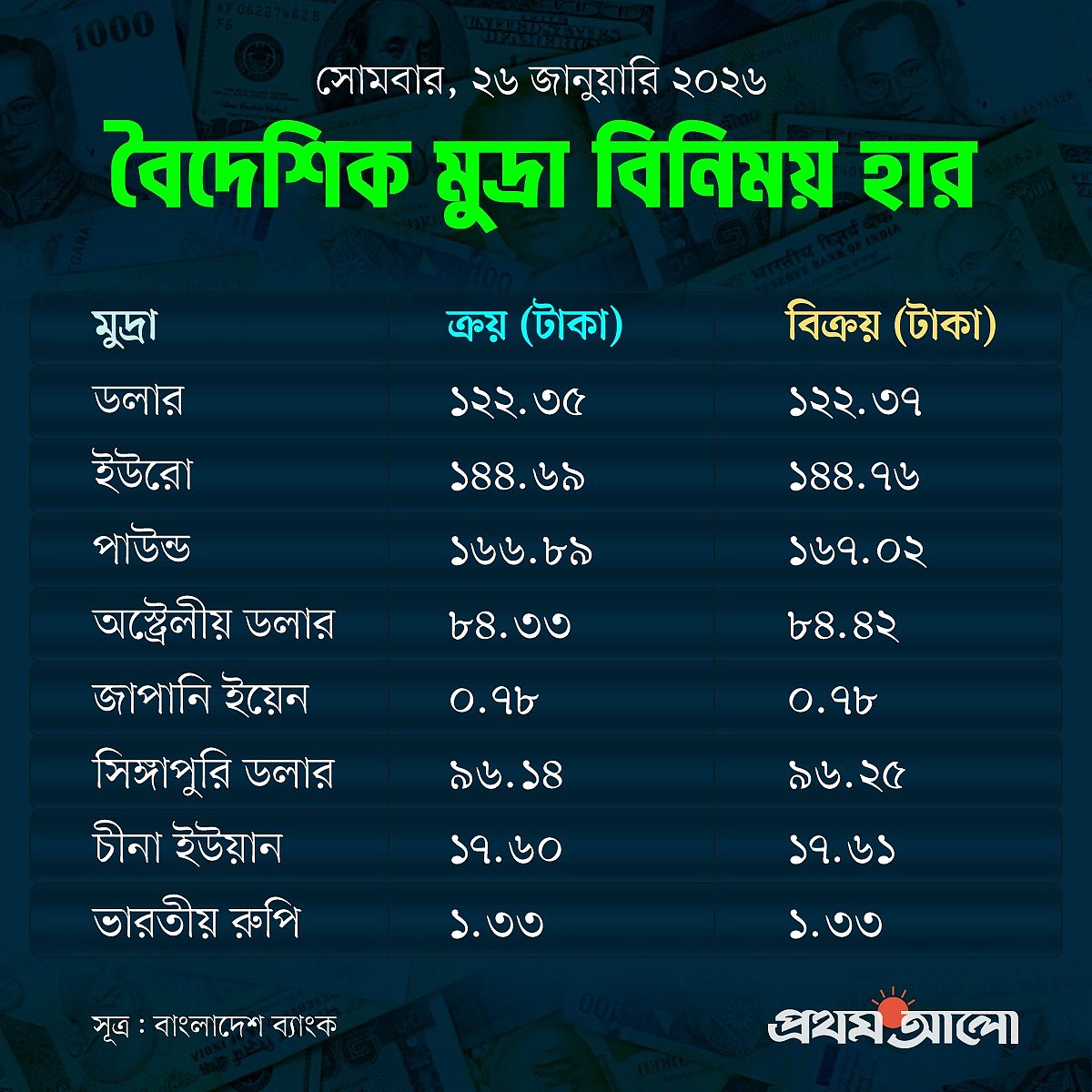 আজ দেশের মুদ্রাবাজারে প্রধান মুদ্রাগুলোর মধ্যে বেশির ভাগ মুদ্রার দাম বেড়েছে। মূল্যবৃদ্ধির তালিকায় আছে ইউরো, পাউন্ড, ইউয়ান, ইয়েন, অস্ট্রেলীয় ডলার ও সিঙ্গাপুরি ডলার। অপরিবর্তিত আছে ভারতীয় রুপির দাম। আজ কোনো মুদ্রার দাম কমেনি।