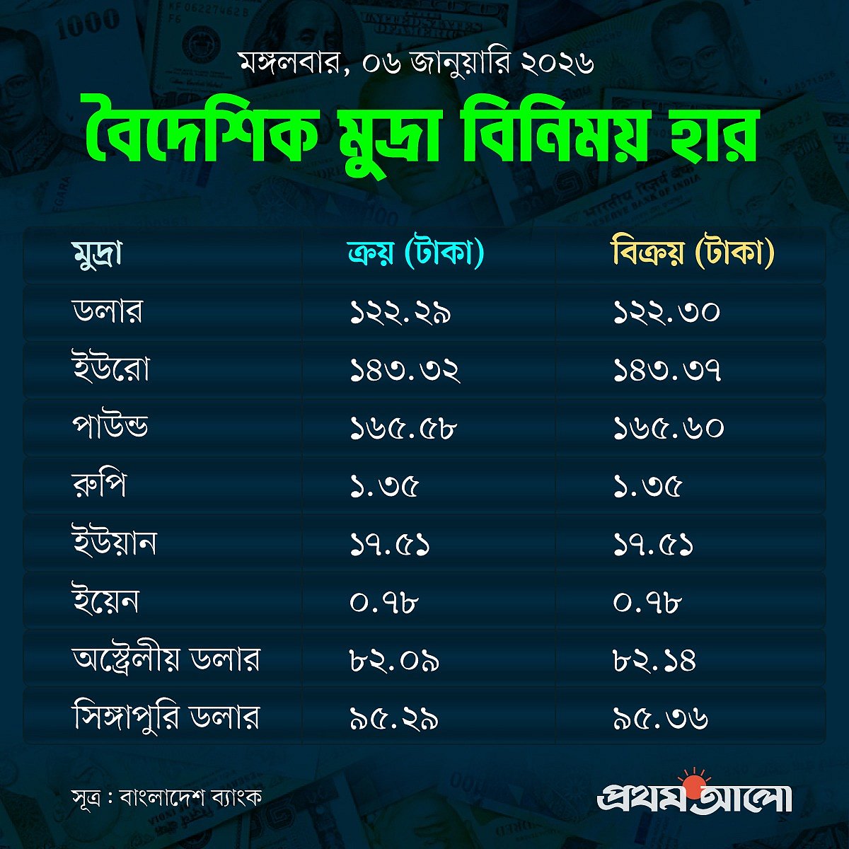 আজ দেশের মুদ্রাবাজারে প্রধান মুদ্রাগুলোর মধ্যে দাম বেড়েছে ইউরো, পাউন্ড, ইয়েন, অস্ট্রেলীয় ডলার ও সিঙ্গাপুরি ডলারের। দাম কমেছে ইউয়ানের। আর দাম অপরিবর্তিত আছে ভারতীয় রুপির।
