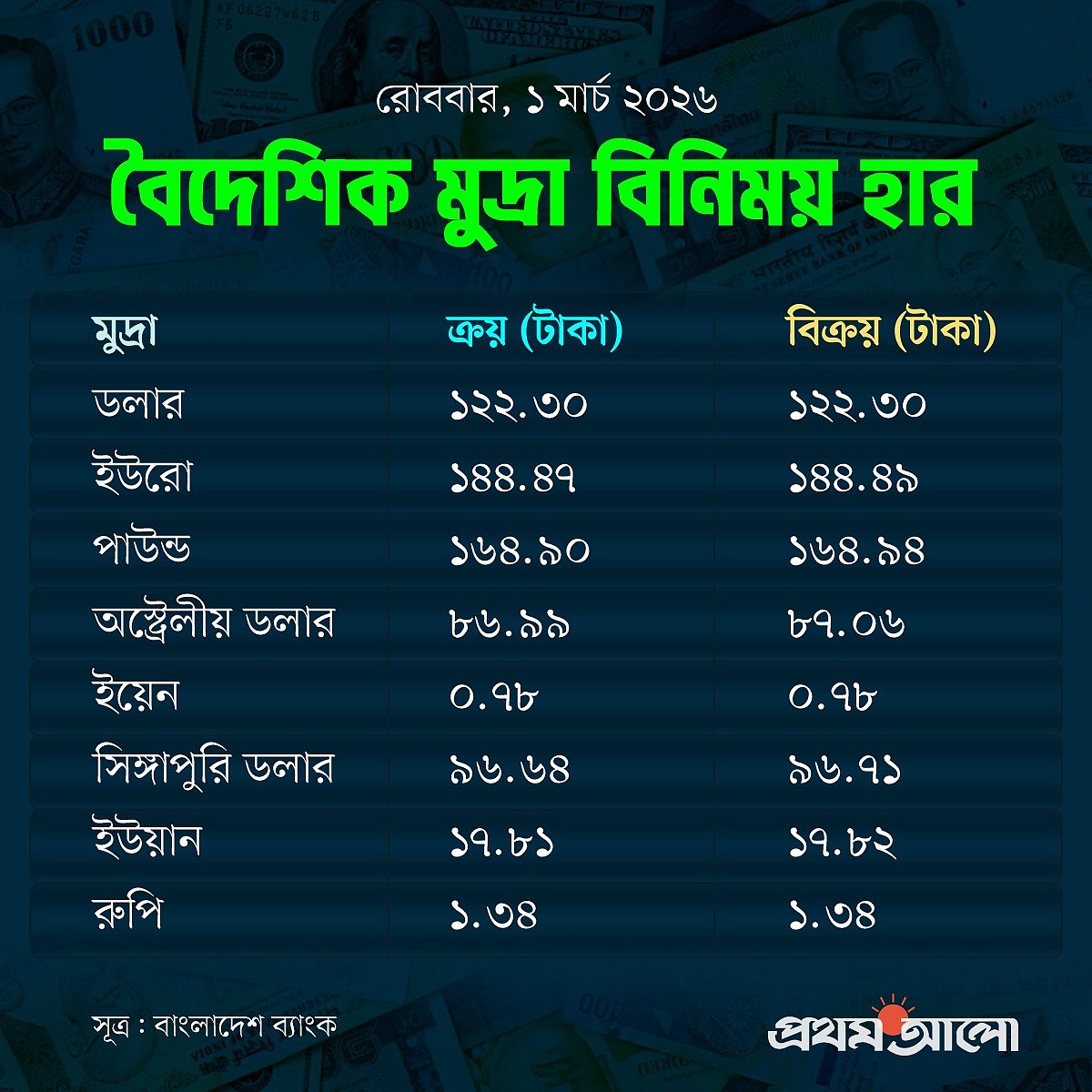 বাংলাদেশ ব্যাংকের তথ্যানুসারে, আজ ডলারের সর্বোচ্চ দাম ১২২ টাকা ৩০ পয়সা। সর্বনিম্ন ও গড় দামও এক— ১২২ টাকা ৩০ পয়সা। সম্প্রতি বিশ্ববাজারে ডলারের দাম বাড়লেও দেশের বাজারে কয়েক মাস ধরেই স্থিতিশীল।