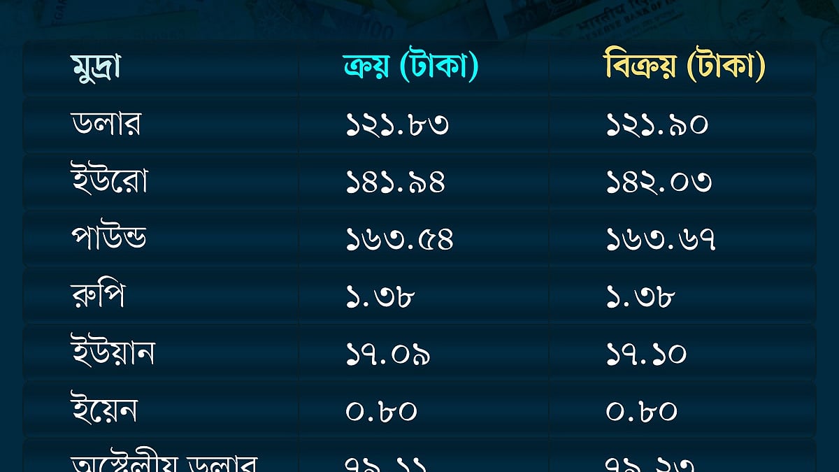 আজ দেশের মুদ্রাবাজারে বেশির ভাগ মুদ্রার দাম বেড়েছে। আজ যেসব মুদ্রার দাম বেড়েছে, সেগুলো হলো ইউরো, পাউন্ড, ইউয়ান ও সিঙ্গাপুরি ডলার। দাম কমেছে কেবল অস্ট্রেলীয় ডলারের। দাম অপরিবর্তিত আছে রুপি ও ইয়েনের।