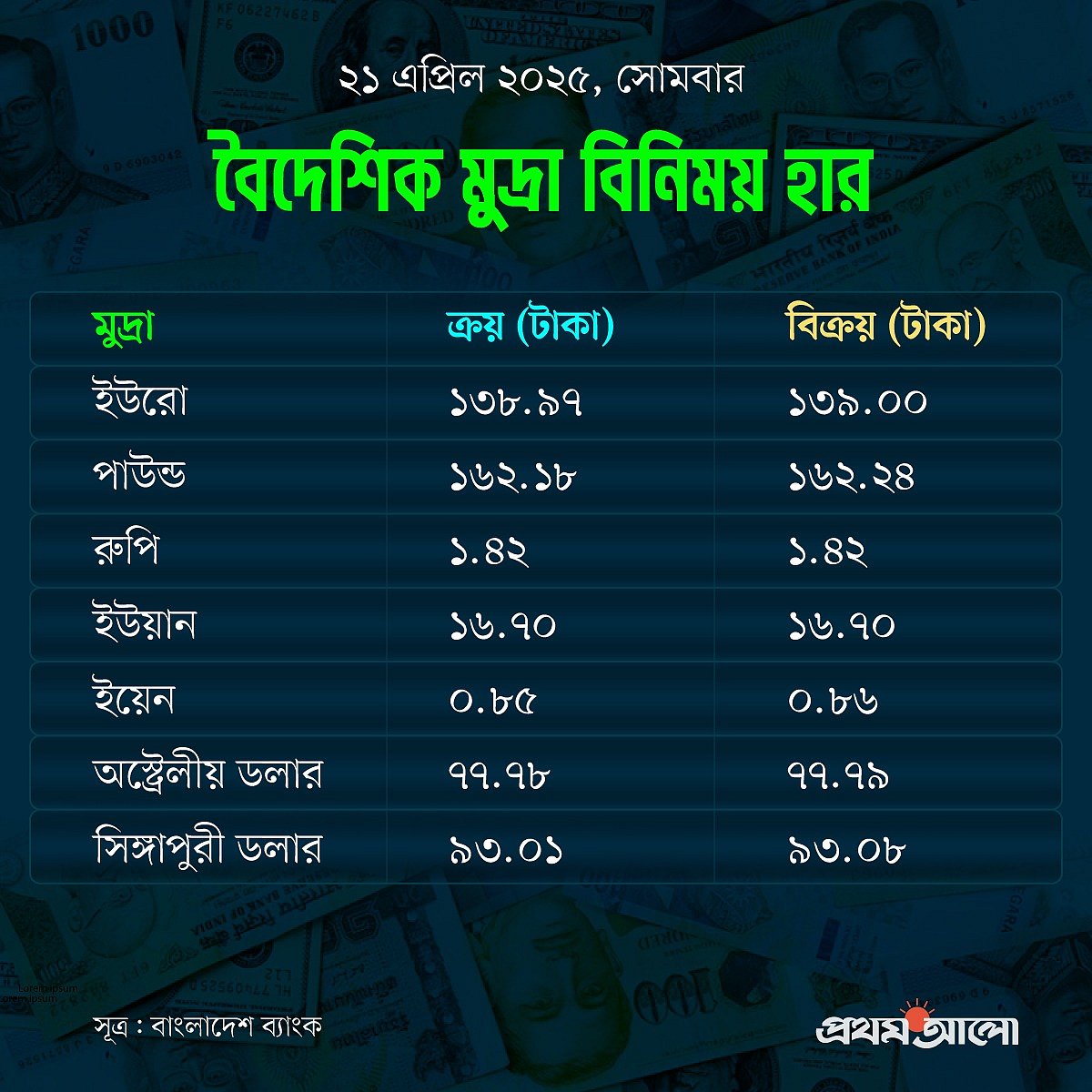 আজ দেশের মুদ্রাবাজারে প্রধান মুদ্রাগুলোর মধ্যে দাম বাড়েনি, আবার কমেনি। অপরিবর্তিত আছে ইউরো, পাউন্ড, ভারতীয় রুপি, ইউয়ান, ইয়েন, অস্ট্রেলীয় ডলার ও সিঙ্গাপুরী ডলারের দাম।