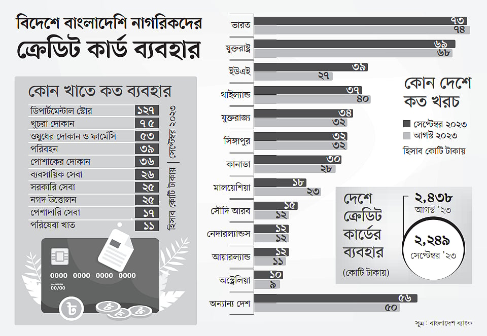 গত সেপ্টেম্বরে দেশের বাইরে বাংলাদেশিরা ক্রেডিট কার্ডে সর্বোচ্চ ৭৩ কোটি টাকা খরচ করেছেন ভারতে। দ্বিতীয় সর্বোচ্চ ৬৯ কোটি টাকা খরচ করেছেন যুক্তরাষ্ট্রে। তালিকায় পরের দেশগুলো হলো ইউএই, থাইল্যান্ড, যুক্তরাজ্য, সিঙ্গাপুর, কানাডা, মালয়েশিয়া, সৌদি আরব, নেদারল্যান্ডস, আয়ারল্যান্ড ও অস্ট্রেলিয়া। বিশ্বের আরও কিছু দেশে খরচ করা হয়েছে ৫৬ কোটি টাকা।