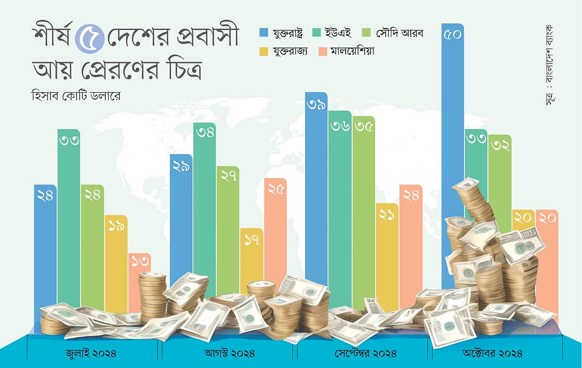 বাংলাদেশ ব্যাংকের প্রতিবেদন অনুযায়ী, অক্টোবরে দেশে মোট প্রবাসী আয় এসেছে প্রায় ২৪০ কোটি ডলার। এর মধ্যে এক–পঞ্চমাংশ বা প্রায় ২১ শতাংশই এসেছে যুক্তরাষ্ট্র থেকে। আর একই মাসে মোট প্রবাসী আয়ের পৌনে ১৪ শতাংশ এসেছে ইউএই থেকে। সেই হিসাবে অক্টোবরে দেশে আসা মোট প্রবাসী আয়ের ৩৫ শতাংশ বা এক-তৃতীয়াংশের বেশি এসেছে যুক্তরাষ্ট্র ও ইউএই থেকে। এই দুটি দেশ থেকে অক্টোবরে মোট প্রবাসী আয় এসেছে ৮৩ কোটি ডলার।