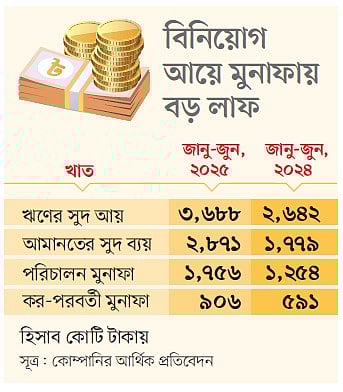 আর্থিক প্রতিবেদনের তথ্য অনুযায়ী, গত জানুয়ারি থেকে জুন—এই ছয় মাসে ব্র্যাক ব্যাংক কর-পরবর্তী সমন্বিত মুনাফা করেছে ৯০৬ কোটি টাকা। গত বছরের একই সময়ে যার পরিমাণ ছিল ৫৯১ কোটি টাকা। সেই হিসাবে এক বছরের ব্যবধানে ব্যাংকটির কর-পরবর্তী মুনাফা ৩১৫ কোটি টাকা বা সোয়া ৫৩ শতাংশের বেশি বেড়েছে। ব্যাংকটির মুনাফার এই প্রবৃদ্ধি সম্ভব হয়েছে মূলত সরকারি ট্রেজারি বিল-বন্ডের আয়ে বড় ধরনের প্রবৃদ্ধি হওয়ায়। গত বছরের প্রথম ছয় মাসের তুলনায় চলতি বছরের প্রথম ছয় মাসে সরকারি ট্রেজারি বিল-বন্ড থেকে ব্র্যাক ব্যাংকের আয় ৮৫২ কোটি টাকা বা সাড়ে ৭১ শতাংশ বেড়েছে। শুধু তা-ই নয়, ২০২৪ সালের পুরো বছরে ব্র্যাক ব্যাংক সরকারি ট্রেজারি বিল-বন্ডের সুদ বাবদ আয় করেছিল ২ হাজার ৮৮১ কোটি টাকা। চলতি বছরের প্রথম ছয় মাসেই তা ২ হাজার ৪৪ কোটি টাকা ছাড়িয়ে গেছে।