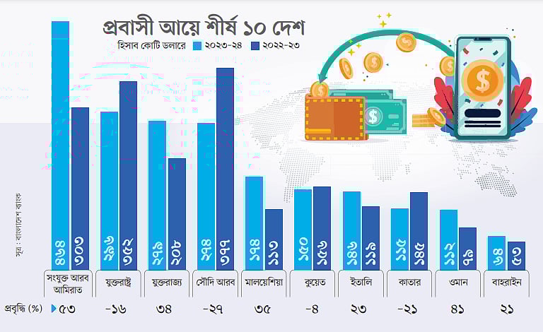 বাংলাদেশ ব্যাংকের হিসাবে, গত অর্থবছরে প্রবাসী আয়ের দিক থেকে শীর্ষে থাকা ১০ দেশের মধ্যে সৌদি আরব, যুক্তরাষ্ট্র, কাতার ও কুয়েত থেকে প্রবাসী আয় আসা আগের বছরের তুলনায় কমেছে। আর বাকি ছয়টি দেশ থেকে আয় আসা বেড়েছে। এর মধ্যে প্রবাসী আয়ে দ্বিতীয় সর্বোচ্চ প্রবৃদ্ধি হয়েছে ওমানে। মালয়েশিয়া থেকে আসা প্রবাসী আয়ে প্রবৃদ্ধি হয়েছে ৩৫ শতাংশ। আর যুক্তরাজ্যের ক্ষেত্রে প্রবৃদ্ধি ৩৪ শতাংশ। এসব দেশ থেকে প্রবাসী আয়ের প্রবৃদ্ধির পেছনে বড় কারণ গত কয়েক বছরের দেশগুলোতে শ্রমিক যাওয়া বেড়েছে।