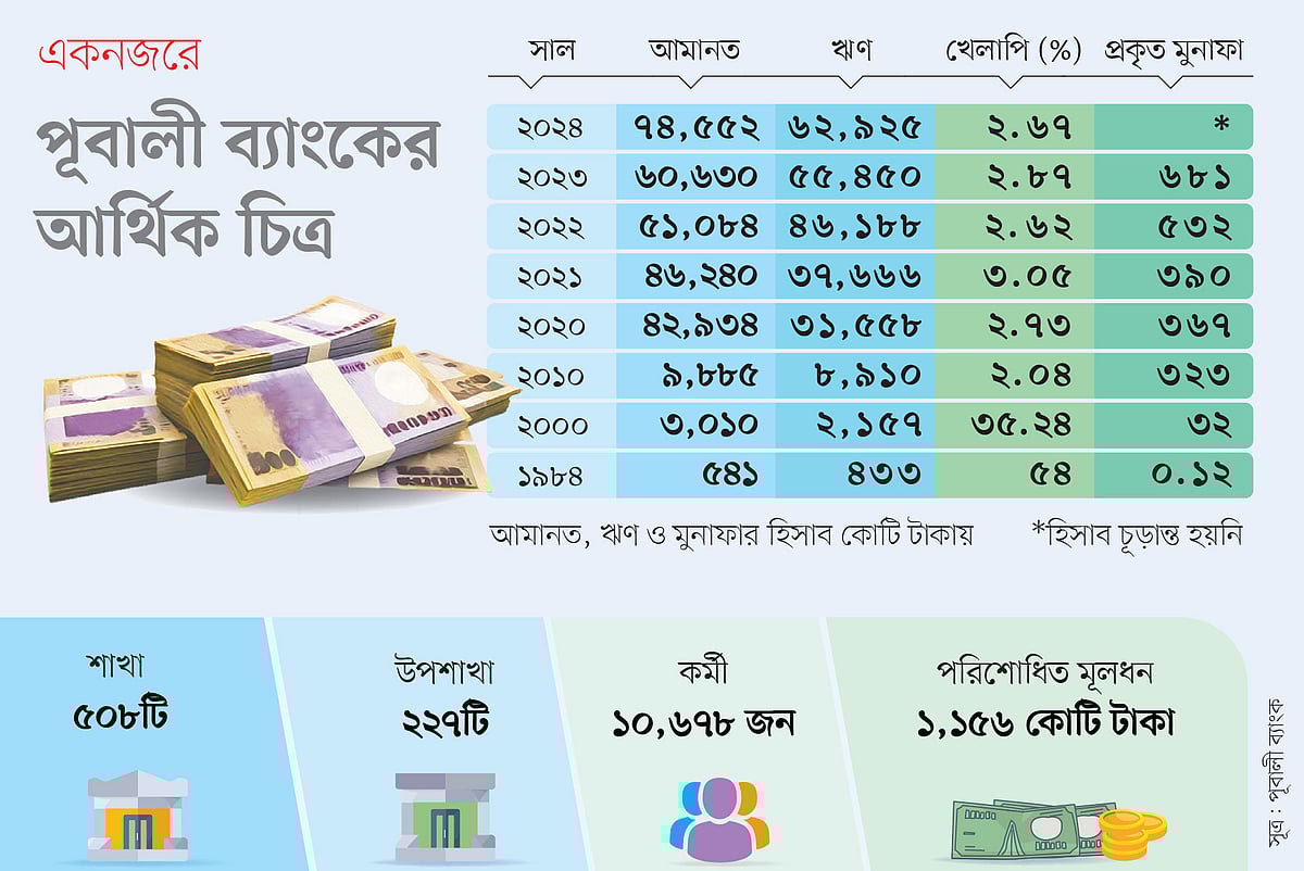 শুরুতে বেসরকারি খাত থেকে জাতীয়করণ। এরপর আবার বেসরকারি খাতে যাত্রা। জন্মের পর থেকে এমন নানা রূপান্তরের মধ্য দিয়ে গেছে পূবালী ব্যাংক। একসময় আর্থিক সংকটে পড়া পূবালী ব্যাংক এখন দেশের শীর্ষস্থানীয় ব্যাংকগুলোর একটি। ভালো গ্রাহক, কম খেলাপি ঋণ ও ব্যবস্থাপনা দক্ষতার কারণে দেশের ব্যাংক খাতে মুনাফায় শীর্ষে থাকা ব্যাংকগুলোর একটি এটি। তবে সমস্যা কাটিয়ে রাতারাতি ব্যাংকটির এ উত্তরণ ঘটেনি। এ জন্য সময় লেগেছে প্রায় ২১ বছর।