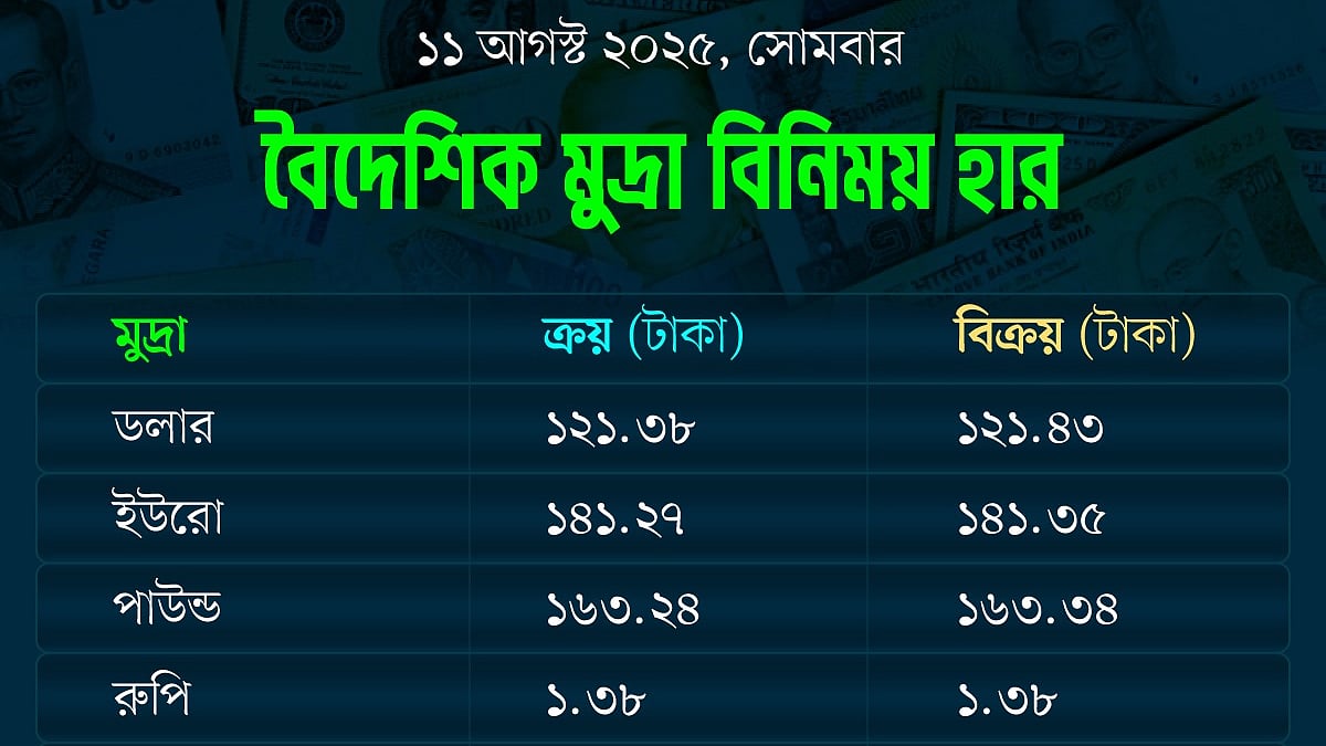 আজ দেশের মুদ্রাবাজারে কিছু মুদ্রার দাম বেড়েছে; অপরিবর্তিত আছে একাধিক মুদ্রা। আজ কোনো মুদ্রার দাম বাড়েনি। দাম কমার তালিকায় আছে ইউরো, পাউন্ড, ইউয়ান, অস্ট্রেলীয় ডলার ও সিঙ্গাপুরি ডলার। অপরিবর্তিত আছে রুপি ও ইয়েনের দাম।