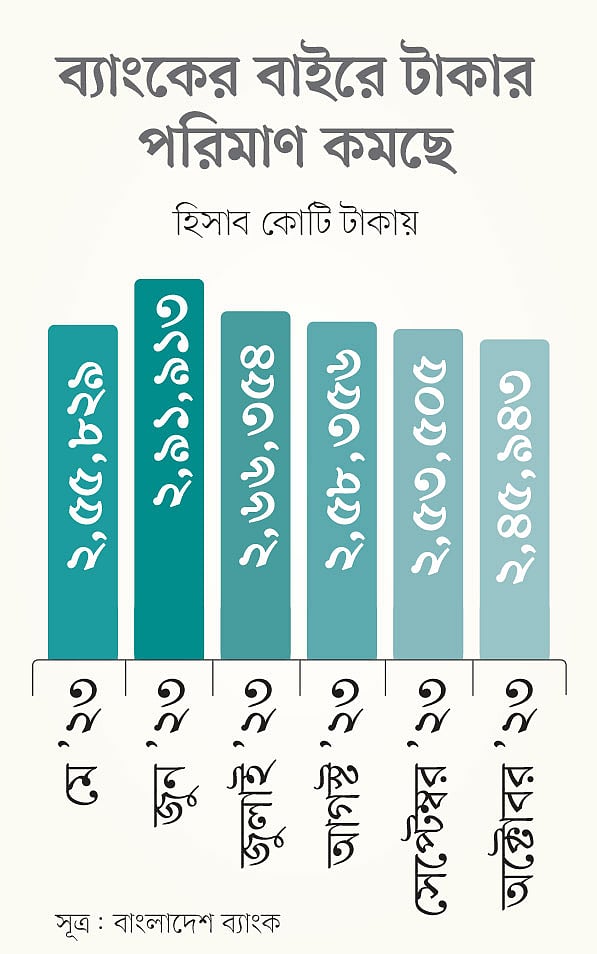 কেন্দ্রীয় ব্যাংকের তথ্য অনুযায়ী, সুদহার বাড়ানোর ফলে জুলাই মাসে ব্যাংকের বাইরে থাকা টাকার পরিমাণ কমে ২ লাখ ৬৬ হাজার ৩৫৪ কোটি টাকায় নেমে আসে। তা আগস্টে আরও কমে হয় ২ লাখ ৫৮ হাজার ৩৫৬ কোটি টাকা। সেপ্টেম্বরে ব্যাংকের বাইরে থাকা টাকার পরিমাণ নেমে আসে ২ লাখ ৫৩ হাজার ৫০৫ কোটিতে, যা অক্টোবরে আরও কমে ২ লাখ ৪৫ হাজার ৯৪৩ কোটি টাকায় নামে।