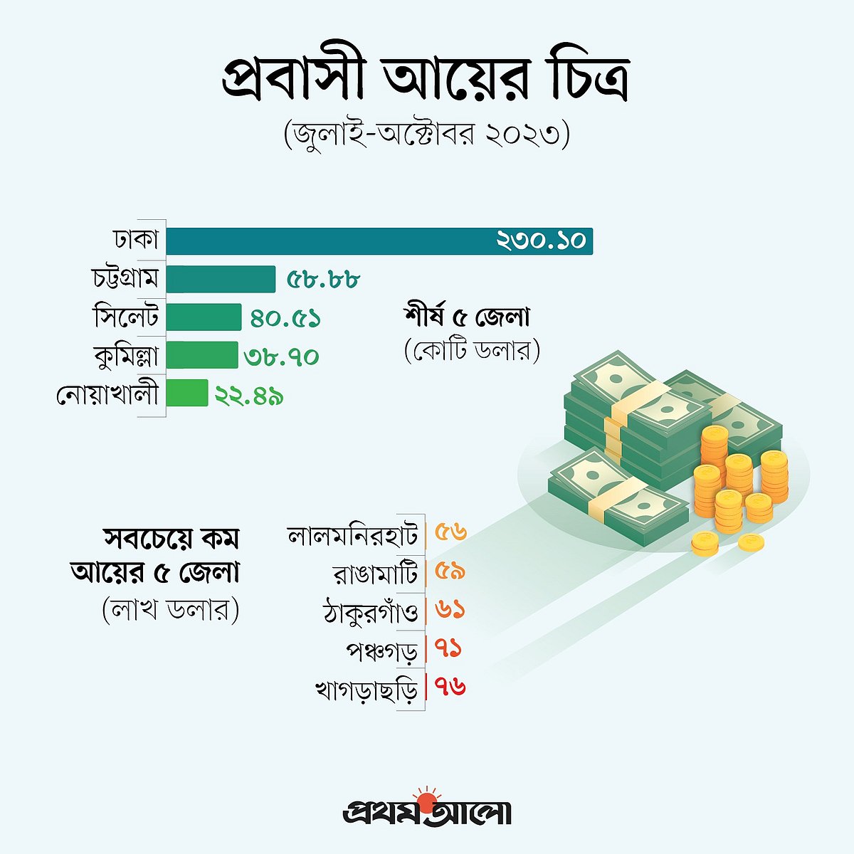 চলতি ২০২৩–২৪ অর্থবছরের প্রথম চার মাসে প্রবাসী আয় প্রাপ্তিতে সবচেয়ে পিছিয়ে রয়েছে লালমনিরহাট, রাঙামাটি, ঠাকুরগাঁও, পঞ্চগড় ও খাগড়াছড়ি—এই পাঁচ জেলা। এর মধ্যে সবচেয়ে কম প্রবাসী আয় এসেছে লালমনিরহাটে, মাত্র ৫৬ লাখ ডলার। অন্য জেলাগুলোর মধ্যে রাঙামাটিতে ৫৯ লাখ, ঠাকুরগাঁওয়ে ৬১ লাখ, পঞ্চগড়ে ৭১ লাখ ও খাগড়াছড়িতে ৭৬ লাখ ডলারের প্রবাসী আয় এসেছে।
