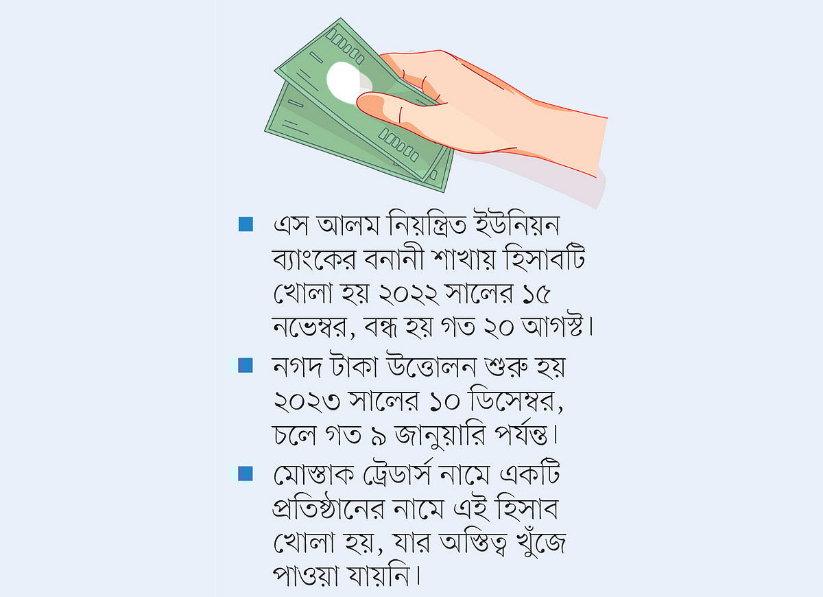 মোস্তাক ট্রেডার্স নামের একটি প্রতিষ্ঠানের নামে এই হিসাব খোলা হয়েছিল। তবে ছাত্র-জনতার অভ্যুত্থানে আওয়ামী লীগ সরকারের পতনের পর গত ২০ আগস্ট হিসাবটি বন্ধ করে দেওয়া হয়। পাশাপাশি ব্যাংকটির অনলাইন তথ্যভান্ডার থেকে এই হিসাবে সব তথ্য গায়েব করে ফেলা হয়। যদিও হিসাব বন্ধ হলেও তথ্য মুছে ফেলার সুযোগ নেই। হিসাবের তথ্য মুছে ফেলা হয়েছে, এমন হিসাবের সংখ্যা ইউনিয়ন ব্যাংকে আরও রয়েছে বলে প্রথম আলোকে নিশ্চিত করেছেন একজন শীর্ষ পর্যায়ের কর্মকর্তা।