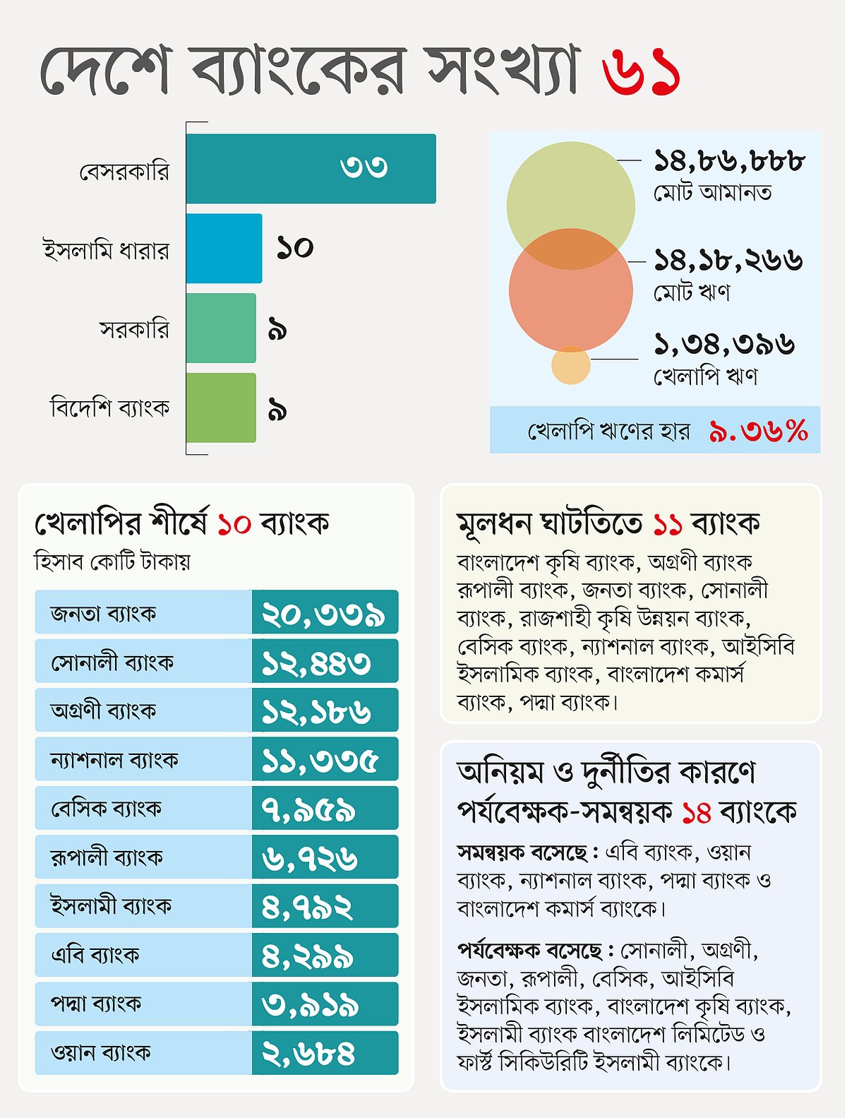 বাংলাদেশে এখন ব্যাংকের সংখ্যা অনেক বেশি। প্রথম দিকে নতুন ব্যাংক দেওয়ার ক্ষেত্রে অর্থনৈতিক বিবেচনা থাকলেও পরে রাজনৈতিক বিবেচনায়ই প্রাধান্য পেয়েছে। এর অনেকগুলোই দুর্বল ব্যাংক হিসেবে চিহ্নিত। বাংলাদেশ ব্যাংকের গভর্নর বলেছেন, এ রকম ব্যাংকের সংখ্যা ১০টি। বহু বছর ধরেই দুর্বল ব্যাংক অন্য একটি ব্যাংকের সঙ্গে একীভূত করার পরামর্শও দেওয়া হচ্ছে। সরকার এ জন্য আইন করার কথা বললেও বাস্তবে কিছুই হয়নি। এতে সামগ্রিক ব্যাংক খাতের ওপরেই নেতিবাচক প্রভাব পড়েছে। এ অবস্থায় সংস্কারের অংশ হিসেবে নতুন করে ব্যাংক না দেওয়া এবং দুর্বল ব্যাংক একীভূত করা প্রয়োজন বলেই বিশেষজ্ঞরা মনে করছেন। পাশাপাশি সরকারি ব্যাংকে কারা পরিচালক হবেন, সুদের বাজারব্যবস্থার ওপর ছেড়ে দেওয়া, ইচ্ছাকৃত খেলাপিদের চিহ্নিত করার নীতিমালা তৈরি এবং আর্থিক কেলেঙ্কারির সঙ্গে জড়িতদের শাস্তি দেওয়া না হলে পরিস্থিতির উন্নতি হবে না বলেও মনে করা হয়।