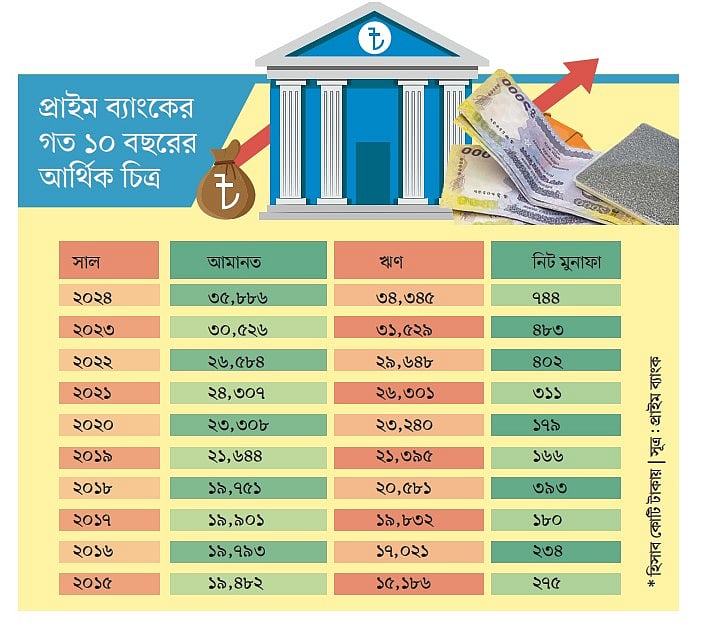 ১৯৯৫ সালে যাত্রা শুরু করে প্রাইম ব্যাংক। ২০০৮ সালে ব্যাংকটির আমানত ছিল ৮ হাজার ৮০২ কোটি টাকা, যা বেড়ে ২০১৬ সালে ১৯ হাজার ৭৯৩ কোটি টাকা ও ২০২৪ সালের শেষে ৩৫ হাজার ৮৭৯ কোটি টাকায় ওঠে। এতে দেখা যায়, প্রথম ২১ বছরে ব্যাংকটির আমানত যত হয়েছিল, তার প্রায় দ্বিগুণ হয়েছে পরের ৯ বছরে।