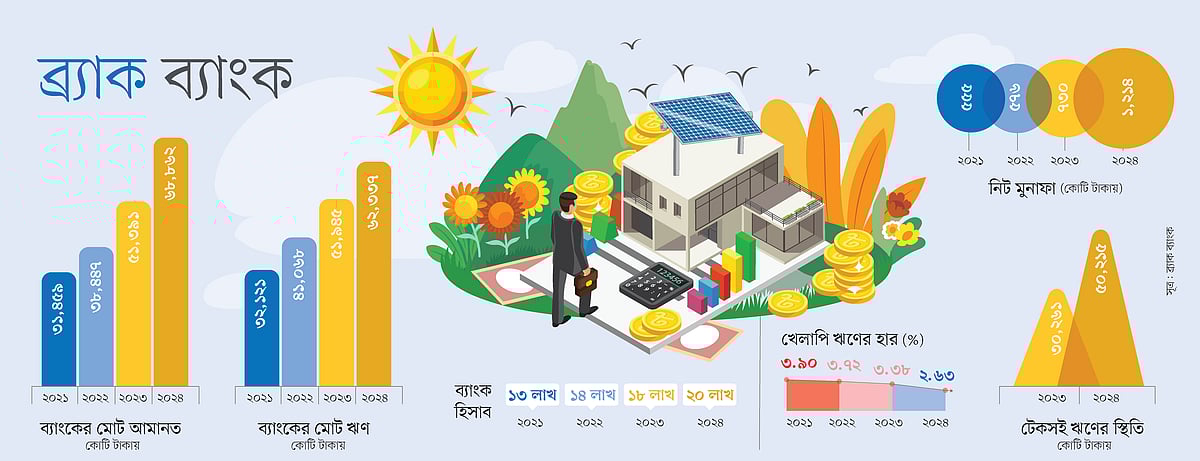 ব্যাংক–সংশ্লিষ্ট সূত্রে জানা যায়, ২০২৩ সালে ব্র্যাক ব্যাংকের টেকসই ঋণের পরিমাণ ছিল ৩০ হাজার ২৬১ কোটি টাকা। গত বছর, তথা ২০২৪ সালে তা বেড়ে দাঁড়ায় ৫০ হাজার ২১৫ কোটি টাকায়। ব্যাংকটি সবুজ শিল্প, নবায়নযোগ্য জ্বালানি, কৃষি এবং নারী উদ্যোক্তাদের কাছে ঋণ পৌঁছে দিয়ে সামাজিক দায়বদ্ধতা ও পরিবেশ সংরক্ষণে গুরুত্বপূর্ণ ভূমিকা রাখছে। বাংলাদেশ ব্যাংকের টেকসই ব্যাংকের তালিকায় ব্র্যাক ব্যাংক টানা পাঁচ বছর ধরে নিজেদের অবস্থান ধরে রেখেছে, যা ব্যাংকটির পরিবেশ ও সামাজিক সচেতনতার উদাহরণ বলে মনে করেন ব্যাংকটির কর্মকর্তারা। তাঁরা বলছেন, যেখানে অনেক ব্যাংক উচ্চ খেলাপি ঋণের চাপে জর্জরিত, সেখানে ব্র্যাক ব্যাংকের খেলাপি ঋণের হার ২০২৪ সাল শেষে কমে দাঁড়িয়েছে ২ দশমিক ৬৩ শতাংশে। অথচ ২০২১ সালেও ব্যাংকটির খেলাপির হার ছিল ৩ দশমিক ৯০ শতাংশ। ব্যাংকটির ঋণ বাড়লেও খেলাপির পরিমাণ না বাড়ায় ব্যাংকটির মূলধন ভিত্তি মজবুত হয়েছে।