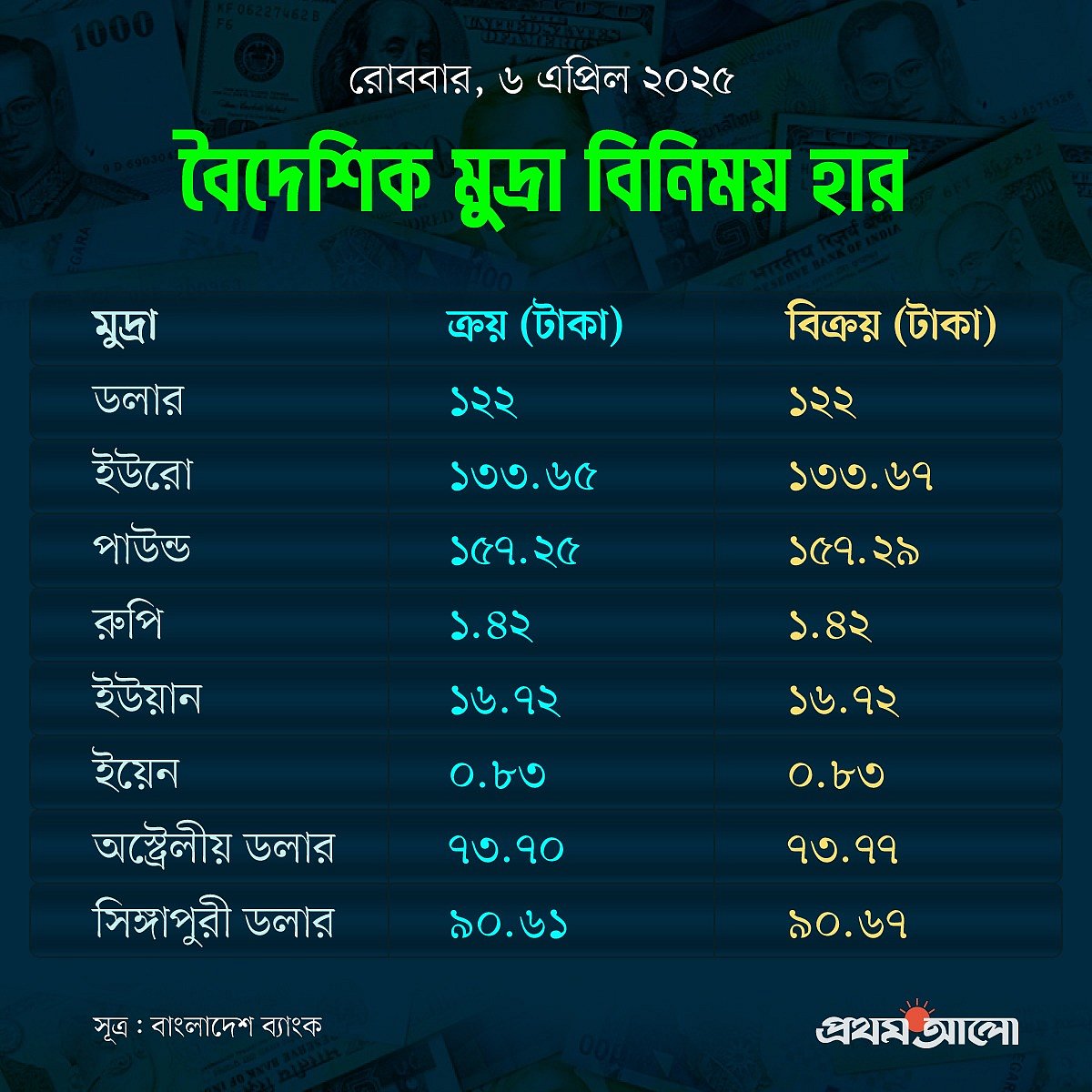 টানা ৯ দিন ছুটির পর আজ রোববার আবার খুলেছে দেশের ব্যাংক-বিমা ও সরকারি অফিস–আদালত। মুদ্রাবাজারও খুলেছে আজ। দেখা যাচ্ছে, আজও মার্কিন ডলারের দর অপরিবর্তিত আছে। সকাল থেকে ১২২ টাকায় ডলার কেনাবেচা হচ্ছে। মাসাধিক কাল ধরে ডলারের দর অপরিবর্তিত আছে।