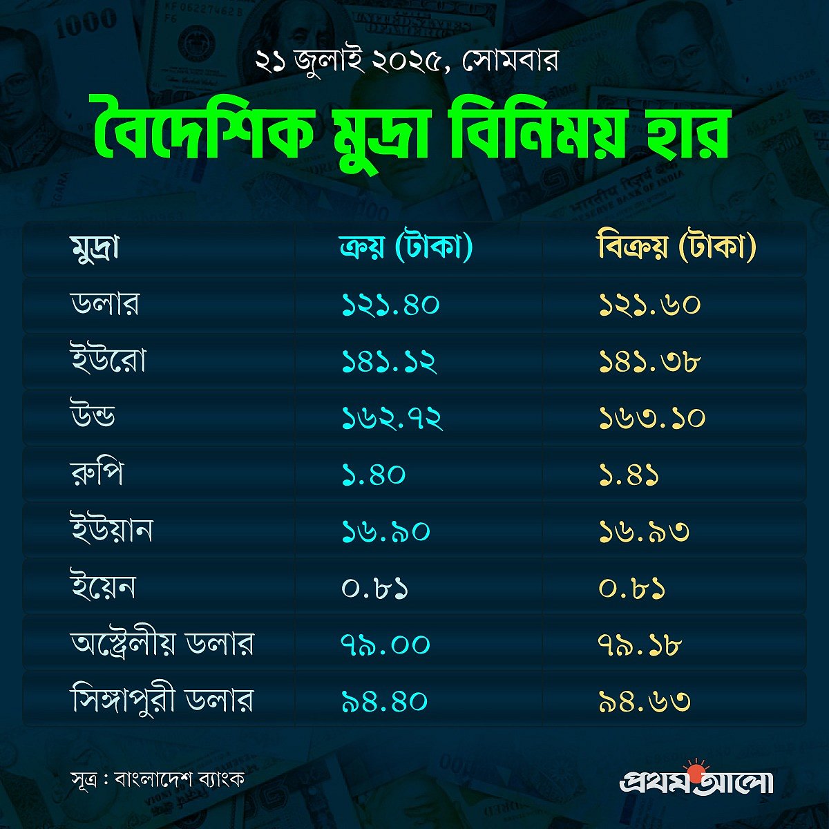 বাংলাদেশ ব্যাংকের তথ্যানুসারে, আজ ডলারের সর্বোচ্চ দাম ১২১ টাকা ৬০ পয়সা ও সর্বনিম্ন দাম ১২১ টাকা ৪০ পয়সা। আজ ডলারের গড় দাম ১২১ দশমিক ৪৯ টাকা।