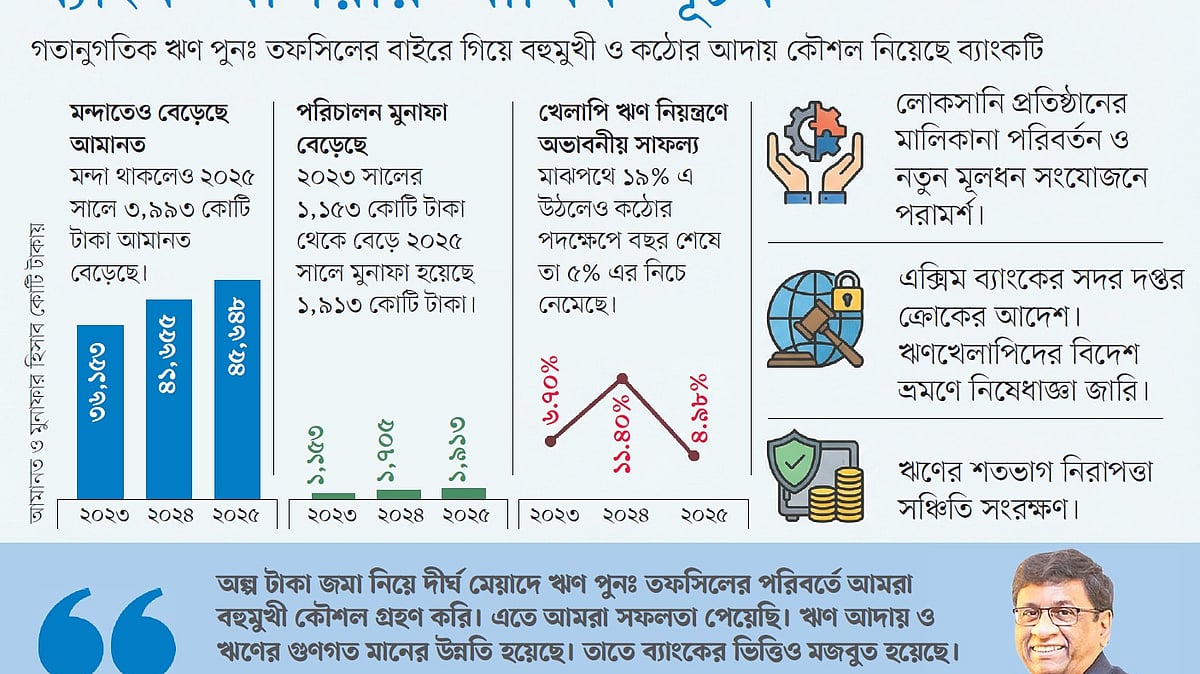 ব্যাংকটি প্রচলিত ধারায় ঋণ পুনঃ তফসিলের পাশাপাশি ঋণ আদায়ে বহুমুখী কৌশল নেয়। এর মধ্যে ছিল গ্রাহকদের ব্যবসা বিক্রিতে সহায়তা করা, খেলাপি ও ইচ্ছাকৃত খেলাপিদের বিরুদ্ধে ফৌজদারি মামলা দায়ের ও ভ্রমণ নিষেধাজ্ঞা জারি, বন্ধকি ও লিয়েন রাখা সম্পদের পাশাপাশি উদ্যোক্তাদের মালিকানাধীন জমি ও কোম্পানির শেয়ার বাজেয়াপ্ত করা। এতে ব্যাংকটি বড় সফলতাও পেয়েছে, যা ব্যাংক খাতে অন্যদের জন্য এখন উদাহরণ হয়ে দাঁড়িয়েছে। গত বছর শেষে ব্যাংকটি ১ হাজার ৯১৩ কোটি টাকা পরিচালন মুনাফা করেছে। এতে ধারণা করা হচ্ছে, কর-পরবর্তী মুনাফাও উল্লেখযোগ্যভাবে বাড়বে।