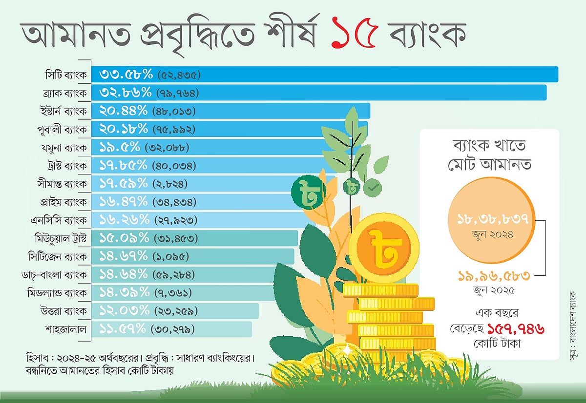 বেসরকারি খাতের দি সিটি ব্যাংকের সূত্রে জানা গেছে, এ বছরের জুনের শেষে তাদের আমানত বেড়ে দাঁড়িয়েছে ৫২ হাজার ৪৩৫ কোটি টাকা। ২০২৪ সালের ৩০ জুন থেকে চলতি ২০২৫ সালের ৩০ জুন পর্যন্ত সিটি ব্যাংকের আমানত বেড়েছে ১৮ হাজার ৩৬৫ কোটি টাকা। অর্থাৎ এক বছরে ব্যাংকটির আমানতে প্রবৃদ্ধি হয়েছে ৩৩ দশমিক ৫৮ শতাংশ। এই ব্যাংকের রিটেইল আমানত বেড়েছে প্রায় ৯ হাজার কোটি টাকা, ক্যাশ ম্যানেজমেন্ট ও করপোরেট আমানত বেড়েছে ৫ হাজার কোটি টাকা। ইসলামি ধারায় আমানত প্রায় আড়াই হাজার কোটি টাকা বেড়েছে। এ ছাড়া এসএমই ও এজেন্ট ব্যাংকিং আমানতও উল্লেখযোগ্য পরিমাণে বৃদ্ধি পেয়েছে।