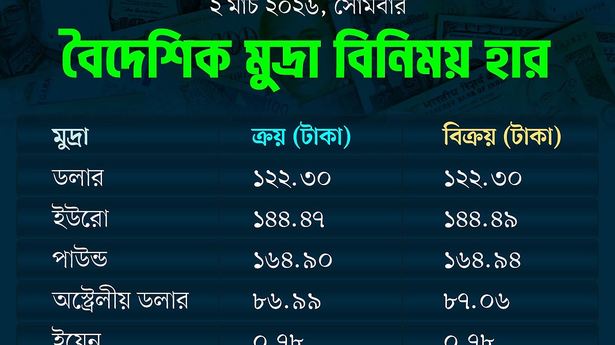 বাংলাদেশ ব্যাংকের তথ্যানুসারে, আজ ডলারের সর্বোচ্চ দাম ১২২ টাকা ৩০ পয়সা। সর্বনিম্ন ও গড় দামও এক—১২২ টাকা ৩০ পয়সা। সম্প্রতি বিশ্ববাজারে ডলারের দাম বাড়লেও দেশের বাজারে কয়েক মাস ধরেই স্থিতিশীল। সম্প্রতি বিশ্ববাজারে ডলারের দাম বাড়লেও দেশের বাজারে কয়েক মাস ধরেই স্থিতিশীল।