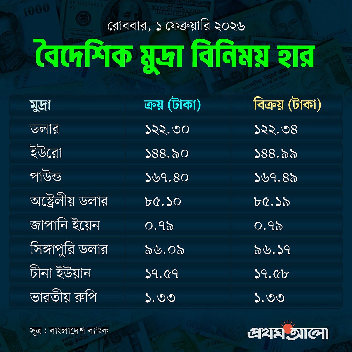 আজ দেশের মুদ্রাবাজারে প্রধান মুদ্রাগুলোর মধ্যে বেশির ভাগ মুদ্রার দাম কমেছে। আজ দাম কমেছে ইউরো, পাউন্ড, অস্ট্রেলীয় ডলার, সিঙ্গাপুরি ডলার ও ইউয়ানের। ভারতীয় রুপি সামান্য বেড়েছে। অপরিবর্তিত আছে জাপানি ইয়েন।