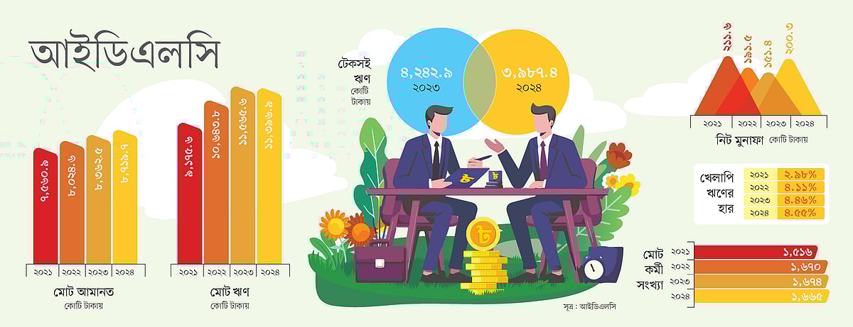 প্রতিষ্ঠানটির আর্থিক তথ্য অনুযায়ী, ২০২১ সালে আইডিএলসির আমানত ছিল ৭ হাজার ৫৬১ কোটি টাকা, যা ২০২৩ সালে বেড়ে হয় ৮ হাজার ৩৬৩ কোটি টাকা। গত বছর আরও বেড়ে দাঁড়ায় ৮ হাজার ৭২০ কোটি টাকায়। অপর দিকে ২০২১ সালে প্রতিষ্ঠানটির ঋণ ছিল ৯ হাজার ১৭৬ কোটি টাকা, যা ২০২৩ সালে তা বেড়ে দাঁড়ায় ১১ হাজার ৫৬৬ কোটি টাকায়। আর গত বছর শেষে আইডিএলসির ঋণের পরিমাণ দাঁড়ায় ১১ হাজার ৩৯৭ কোটি টাকায়। গত বছর শেষে টেকসই খাতে আইডিএলসি ফাইন্যান্সের ঋণ ছিল ৩ হাজার ৯৮৭ কোটি টাকা। ২০২৪ সালে পরিবেশবান্ধব অর্থায়ন করেছে ৫৮৫ কোটি টাকা ও টেকসই অর্থায়ন করেছে ২ হাজার ২৩৬ কোটি টাকা। আর্থিক প্রতিষ্ঠানের গড় খেলাপি ঋণ যেখানে ৩৫ শতাংশ, সেখানে আইডিএলসি ফাইন্যান্সের খেলাপি ঋণের হার সাড়ে ৪ শতাংশ।