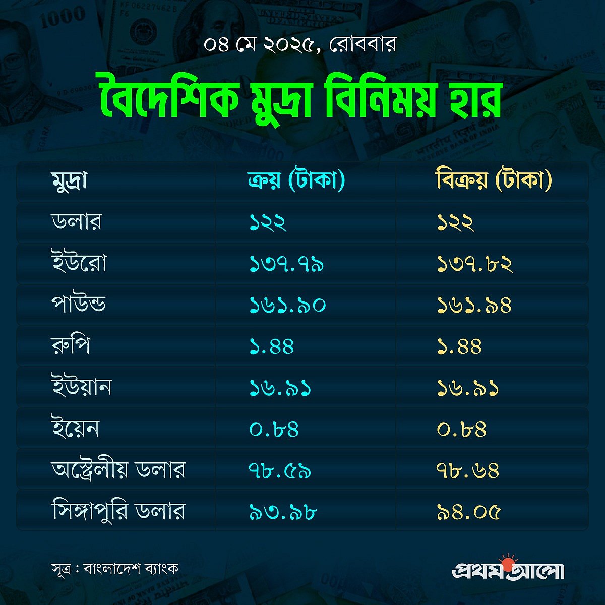 আজ রোববার সপ্তাহের প্রথম কার্যদিবস। দেশের মুদ্রাবাজারের লেনদেন চলছে। অন্যান্য দিনের মতো আজও মার্কিন ডলারের দর অপরিবর্তিত আছে। কয়েক মাস ধরে দেশের মুদ্রাবাজারে ১২২ টাকায় ডলার বেচাকেনা হচ্ছে।