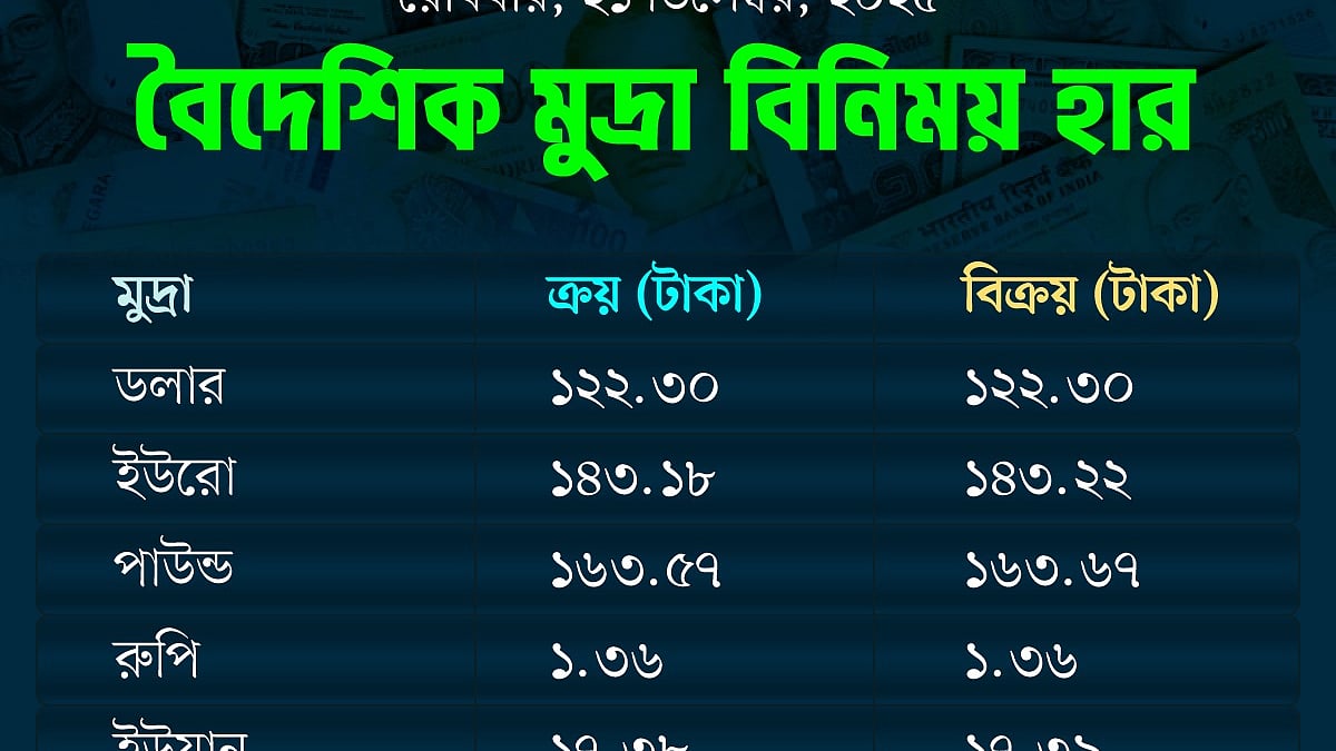 আজ রোববার সপ্তাহের প্রথম কার্যদিবসে দেশের মুদ্রাবাজারে লেনদেন চলছে। আজ বাজারে ডলারের দাম অপরিবর্তিত আছে।