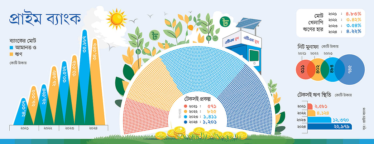 শুরু থেকে ব্যাংকিংয়ে নতুন পণ্য-সেবা চালু ও সেবার মানে পারদর্শিতা দেখিয়ে আসছে প্রাইম ব্যাংক। গত ৩০ বছরে ব্যাংকটির গ্রাহকসংখ্যা বেড়ে দাঁড়িয়েছে সাড়ে ১১ লাখে। গত আট বছরে আমানত ও ঋণ বেড়ে দ্বিগুণ হয়েছে। পাঁচ বছরে নিট মুনাফা বেড়ে হয়েছে চার গুণের বেশি। শুধু তা–ই নয়, করপোরেট ব্যাংক নামে পরিচিতি থাকলেও প্রাইম ব্যাংক গুরুত্ব দিয়ে যাচ্ছে টেকসই অর্থায়নে। সামাজিক দায়বদ্ধতা কার্যক্রমের (সিএসআরে) মাধ্যমে সমাজে ইতিবাচক পরিবর্তনেও গুরুত্বপূর্ণ ভূমিকা রাখছে ব্যাংকটি। ফলে পরপর তিন বছর টেকসই ব্যাংকিংয়ের তালিকায় স্থান করে নিয়েছে প্রাইম ব্যাংক।