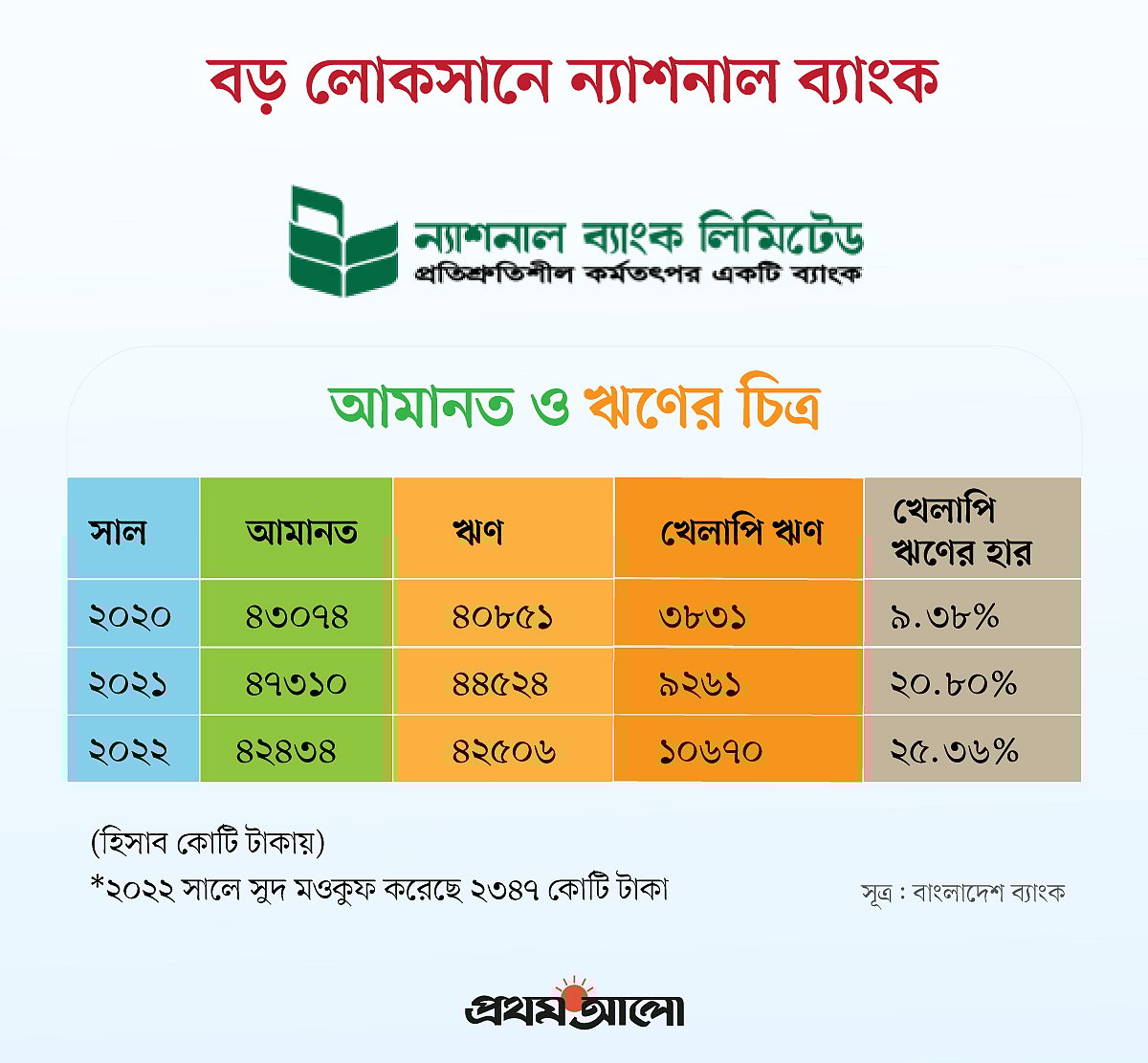 বিদায়ী বছরে, অর্থাৎ ২০২২ সাল শেষে খেলাপি ঋণের হার দাঁড়িয়েছে ২৫ দশমিক ৩৬ শতাংশ। টাকার অঙ্কে খেলাপি ঋণের পরিমাণ হয়েছে ১০ হাজার ৬৭০ কোটি টাকা। এর ফলে খেলাপি ঋণের বিপরীতে বেশি পরিমাণ নিরাপত্তা সঞ্চিতি রাখতে হচ্ছে, যা ব্যাংকটিকে লোকসানে যেতে বাধ্য করেছে।