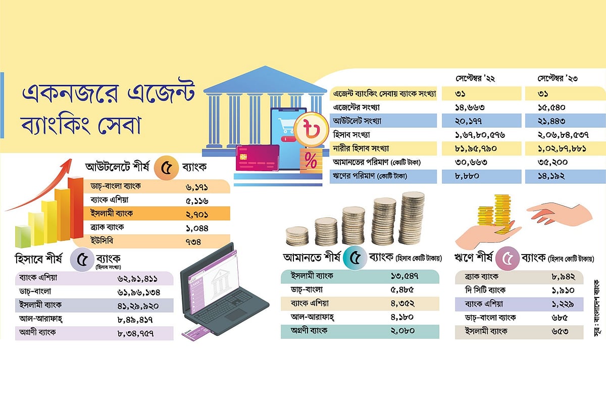 এসব গ্রাহক শুধু হিসাব খুলেছেন বিষয়টি তেমন না। এসব গ্রাহক এজেন্টদের কাছে বিভিন্ন ধরনের আমানত হিসাব খুলেছেন। এসব হিসাবে জমা হয়েছে ৩৫ হাজার ২০০ কোটি টাকা। আর এজেন্টদের মাধ্যমে ঋণ বিতরণ হয়েছে ১৪ হাজার ১৯২ কোটি টাকা। ২০২২ সালের সেপ্টেম্বরের তুলনায় গত বছরের সেপ্টেম্বরে আমানতে প্রবৃদ্ধি হয়েছে ১৪ দশমিক ৮০ শতাংশ, তবে ঋণে প্রবৃদ্ধি হয়েছে অনেক বেশি, ৮৯ দশমিক ৮১ শতাংশ।