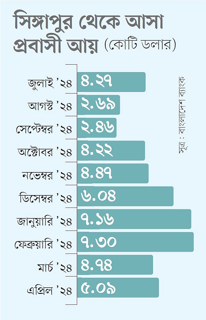 বাংলাদেশ ব্যাংকের তথ্যে দেখা গেছে, ২০২১-২২ অর্থবছরে সিঙ্গাপুর থেকে ৩৮ কোটি ৫২ লাখ মার্কিন ডলারের প্রবাসী আয় আসে, যা ২০২২-২৩ অর্থবছরে বেড়ে হয় ৪২ কোটি ৩৩ লাখ ডলার। আর গত ২০২৪–২৫ অর্থবছরের জুলাইয়ে ৪ কোটি ২৭ লাখ, আগস্টে ২ কোটি ৬৯ লাখ, সেপ্টেম্বরে ২ কোটি ৪৬ লাখ ও অক্টোবরে ৪ কোটি ২২ লাখ, নভেম্বরে ৪ কোটি ৪৭ লাখ, ডিসেম্বরে ৬ কোটি ৪ লাখ, জানুয়ারিতে ৭ কোটি ১৬ লাখ, ফেব্রুয়ারিতে ৭ কোটি ৩০ লাখ, মার্চে ৪ কোটি ৭৪ লাখ ও এপ্রিলে ৫ কোটি ৯ লাখ ডলার আসে।