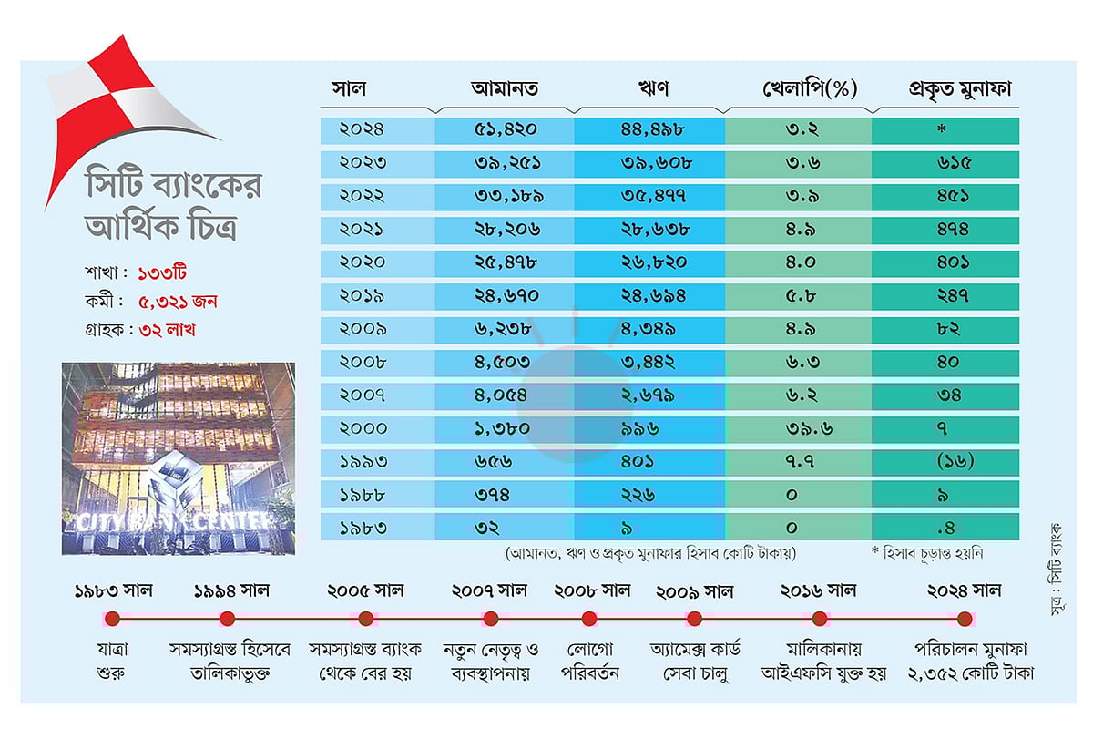 কয়েক বছর আগে একসময়ের সমস্যাগ্রস্ত ব্যাংকটির মালিকানায় যুক্ত হয়েছে বিশ্বব্যাংক গ্রুপের সংস্থা ইন্টারন্যাশনাল ফাইন্যান্স করপোরেশন (আইএফসি)। বিকাশের সঙ্গে মিলে ব্যাংকটি চালু করেছে ডিজিটাল অতিক্ষুদ্র ঋণ। সব মিলিয়ে নব্বইয়ের দশকের দুর্বল সিটি ব্যাংক এখন দেশের শক্তিশালী ব্যাংকের একটি।