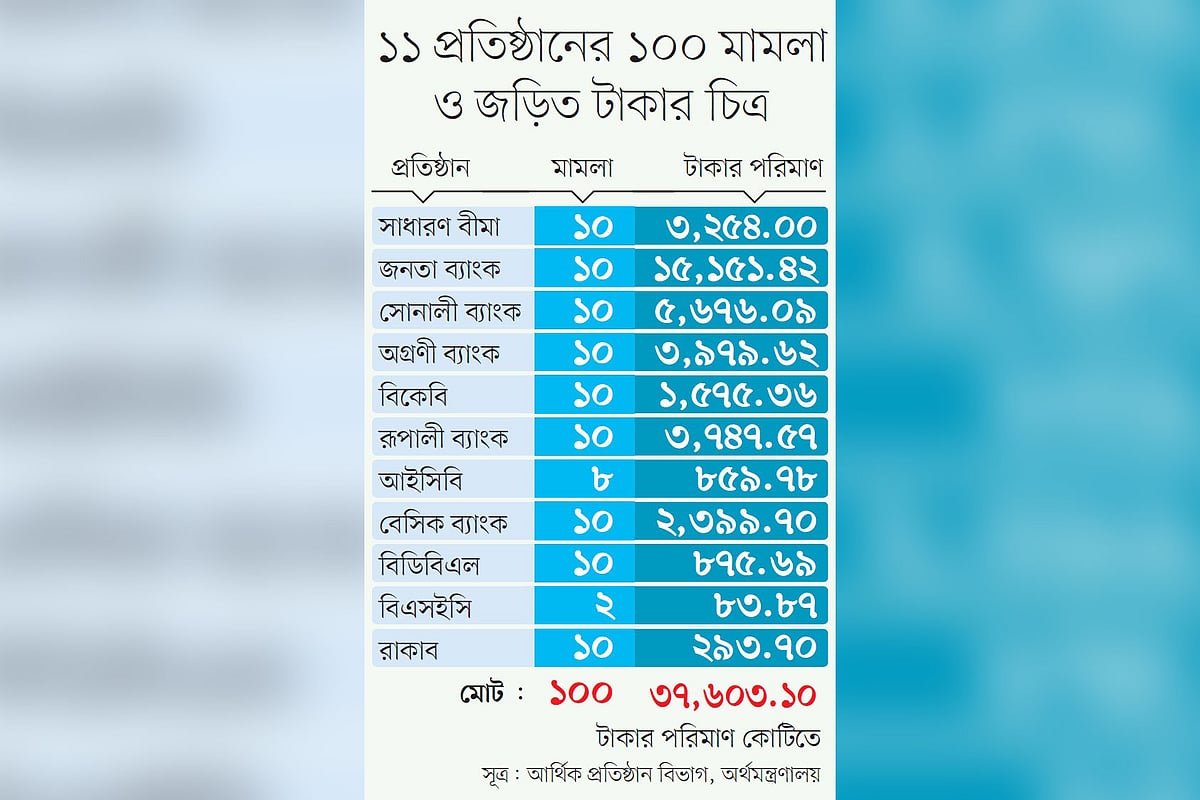 ১০০ মামলার বিপরীতে মোট টাকার পরিমাণ হচ্ছে ৩৭ হাজার ৬০৩ কোটি টাকা। এর মধ্যে জনতা ব্যাংকের একারই ১০ মামলার বিপরীতে ১৫ হাজার ১৫১ কোটি টাকা। বৈঠকে অংশ নেওয়া জনতা ব্যাংকের এমডি মজিবুর রহমান প্রথম আলোকে বলেন, ‘আমরা কিছু নির্দেশনা পেয়েছি। সে অনুযায়ী এখন পদক্ষেপ নেওয়া হবে।’
