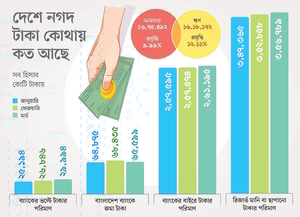 বাংলাদেশ ব্যাংকের হিসাবে, ফেব্রুয়ারির তুলনায় মার্চে মানুষের হাতে থাকা টাকার পরিমাণ বেড়েছে ৩ হাজার ৬২১ কোটি টাকা। ব্যাংক খাতসংশ্লিষ্ট ব্যক্তিরা বলছেন, মানুষ ব্যাংক থেকে টাকা তুলে নেওয়ার পর যা আর ব্যাংকে ফেরত আসে না, তা-ই ব্যাংকের বাইরে থাকা টাকা হিসেবে পরিচিত। এই টাকা মানুষ হয় দৈনন্দিন প্রয়োজন মেটাতে, নয়তো বেশি লাভের আশায় ব্যাংকের বাইরে বিভিন্ন সমিতি, জমি, ফ্ল্যাটে বিনিয়োগ করেন। আবার কেউ কেউ টাকা তুলে ঘরেও রেখে দেন।