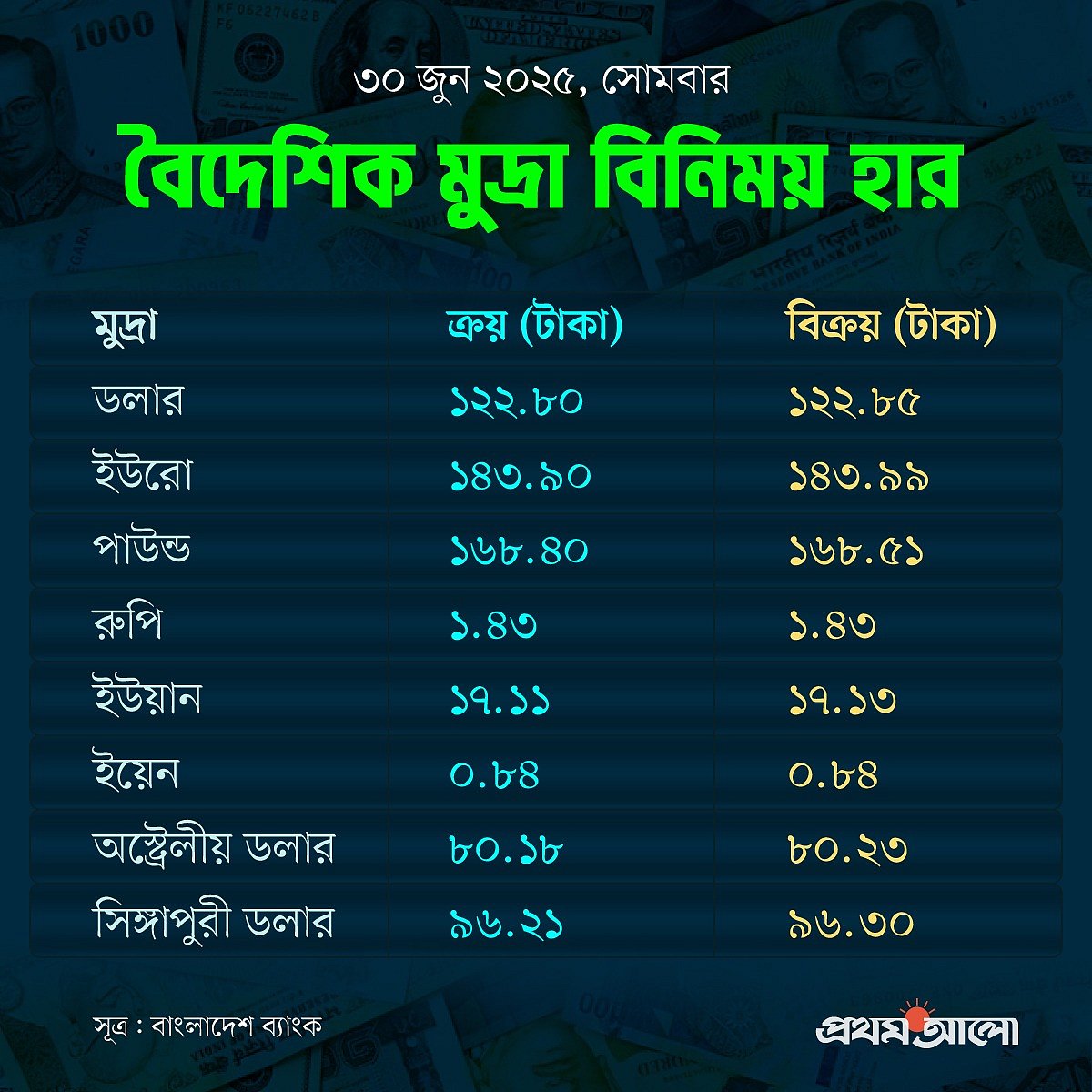বাংলাদেশ ব্যাংকের তথ্যানুসারে, দেশের মুদ্রাবাজারে আজ ডলারের সর্বোচ্চ দাম ১২২ দশমিক ৮৫ টাকা এবং সর্বনিম্ন দর ১২২ দশমিক ৮০ টাকা। আজ ডলারের গড় দাম ১২২ দশমিক ৮৩ টাকা।