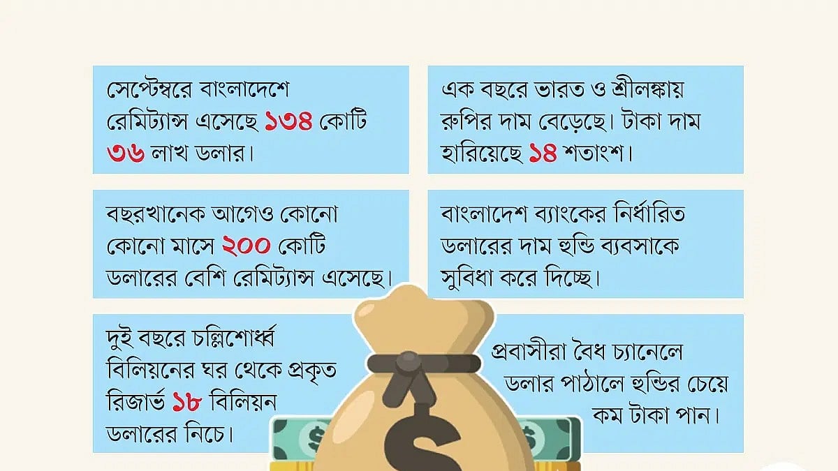 রেমিট্যান্সের (প্রবাসী আয়) অবস্থা দিন দিন খারাপের দিকেই যাচ্ছে। সেপ্টেম্বরে বাংলাদেশ রেমিট্যান্স এসেছে মাত্র এসেছে ১৩৪ কোটি ৩৬ লাখ ডলার, যা প্রায় সাড়ে তিন বছরের মধ্যে সর্বনিম্ন। বর্তমান সময়ের বিচারে প্রতি মাসে কমপক্ষে ২৫০ কোটি মার্কিন ডলার প্রবাসী আয় আসা উচিত। বছরখানেক আগেও কোনো কোনো মাসে ২০০ কোটি ডলারের ওপরে রেমিট্যান্স এসেছে। কিন্তু গত কয়েক মাসের প্রবণতা নির্দ্বিধায় বলে দিচ্ছে, এভাবে রক্তহীন হতে থাকলে রেমিট্যান্সের রোগীকে আর বাঁচানো সম্ভব নয়। রিজার্ভ–সংকট রক্তস্বল্পতার মতো দিনে দিনে নাজুক হচ্ছে।